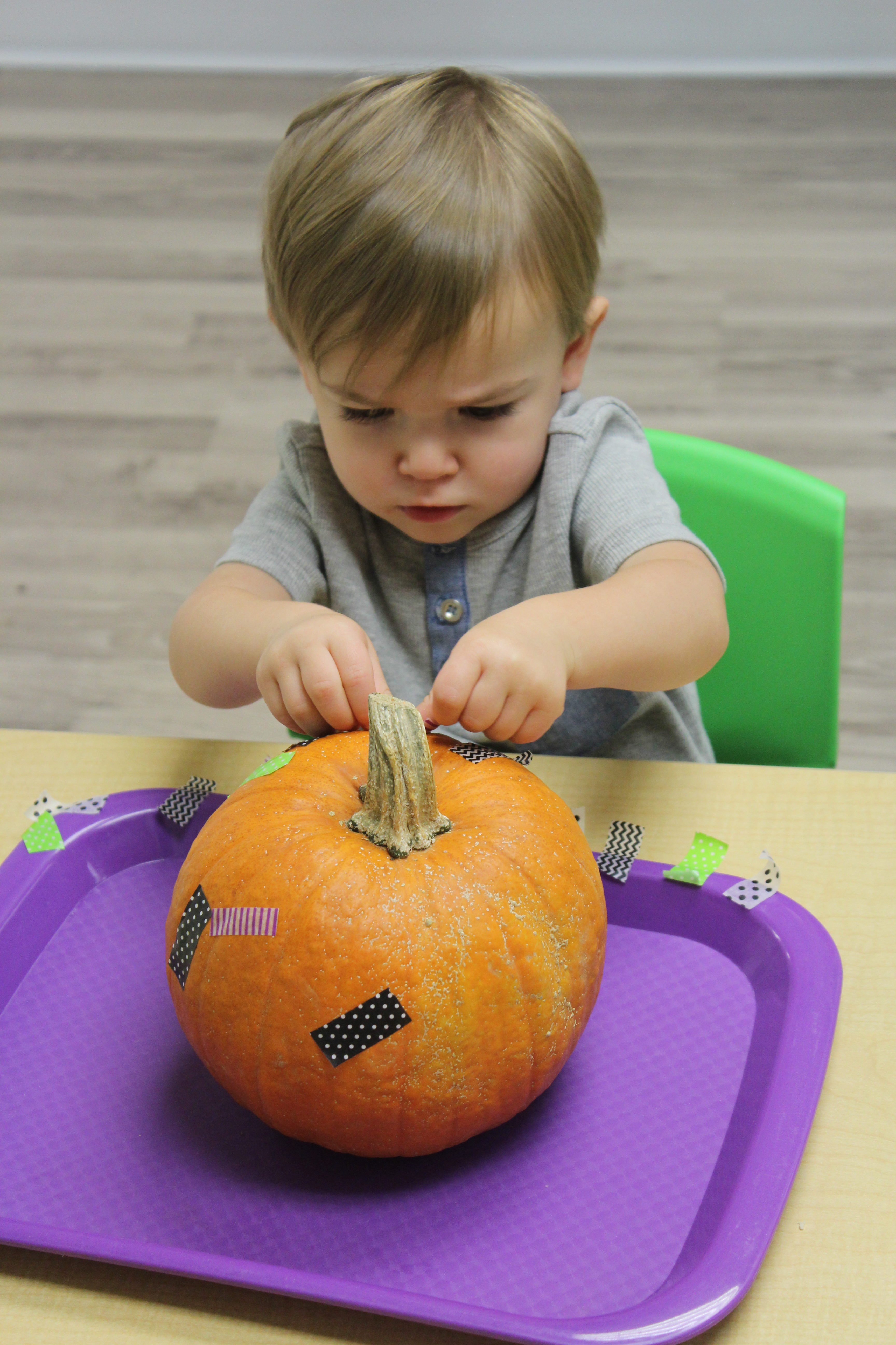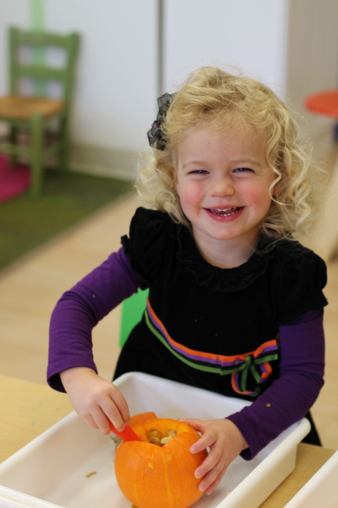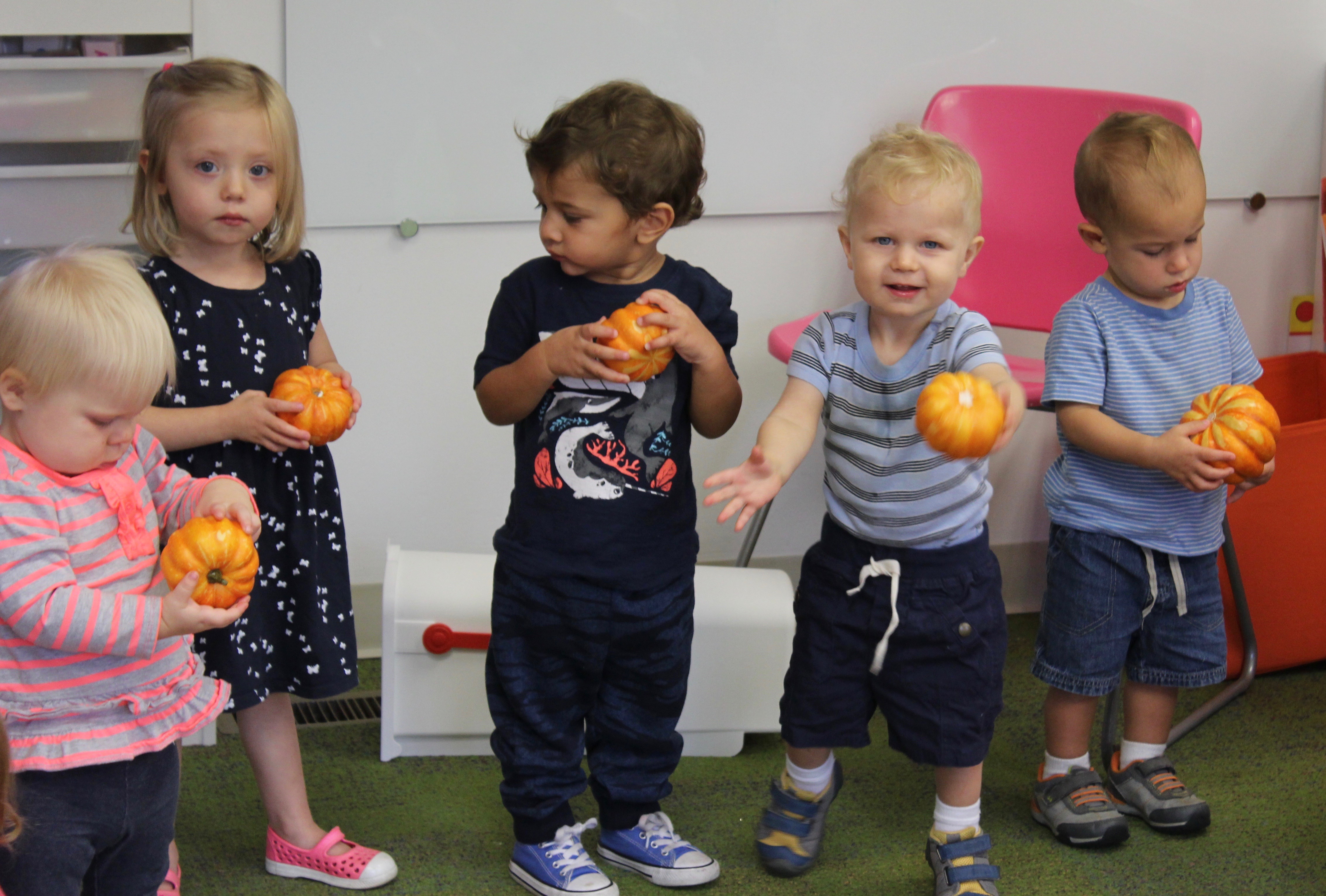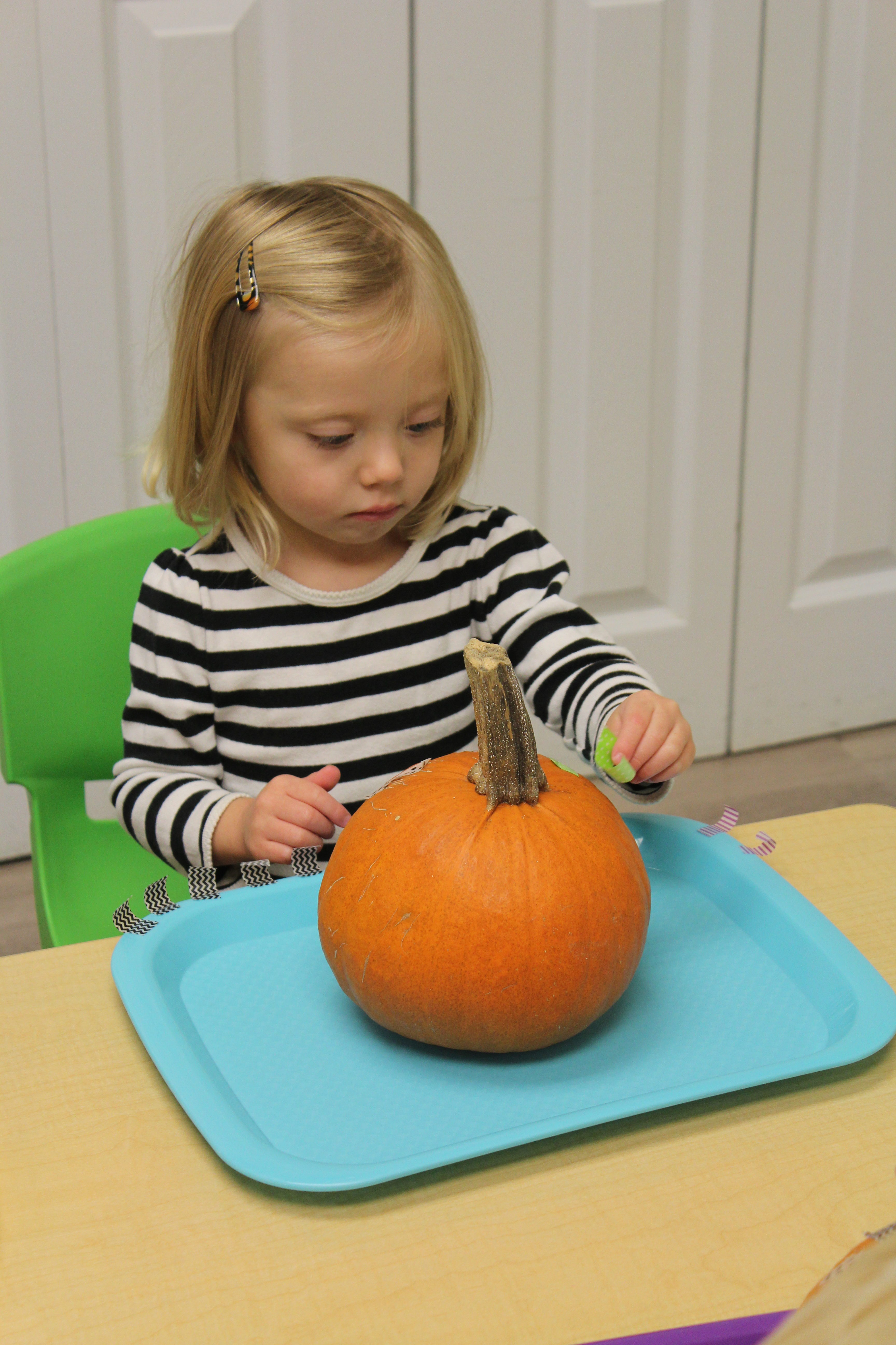 The month of October presents itself with many opportunities to explore pumpkins.  We opened a pumpkin and used our senses to feel, smell,  and observe the pumpkin.  The toddlers also did a 5 Little Pumpkins craft and acted out the fingerplay in front of the class!  We decorated pumpkins using washi tape and plan to bathe them next week!