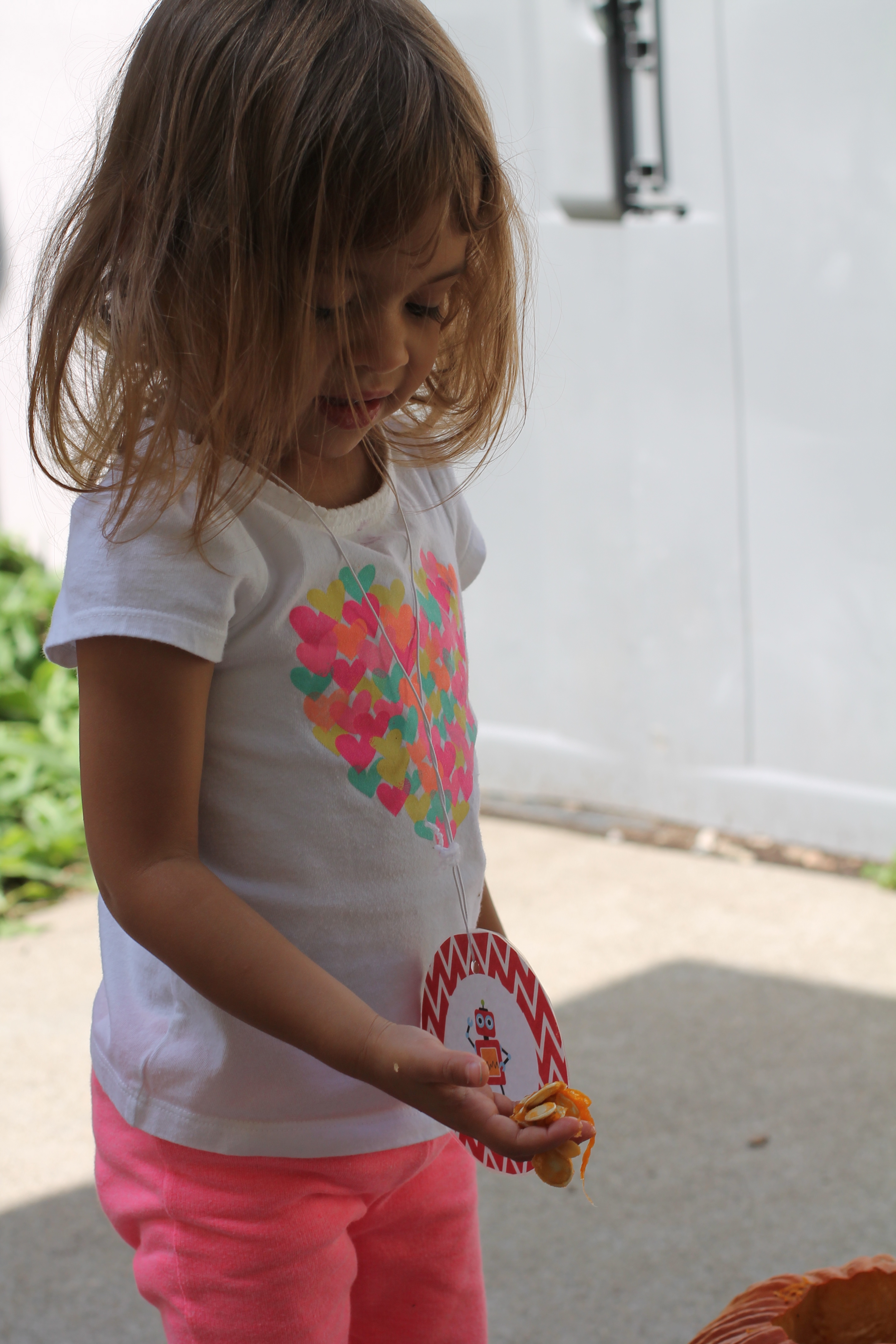Five little pumpkins sitting on a gate…  We have had so much fun with this little song.  We did an art project with pumpkin stickers, read several book versions, put 5 pumpkins on the magnet board, and acted the song out.  We also made yummy pumpkin muffins, decorated mini pumpkins with washi tape, and played hot pumpkin (a version of hot potato).  Our sensory bin for the month has been pumpkin seeds with scoops and tins to “make pumpkin pie”.  We also plan to use all of our senses to explore the outside and inside of a pumpkin!  Happy orange October!