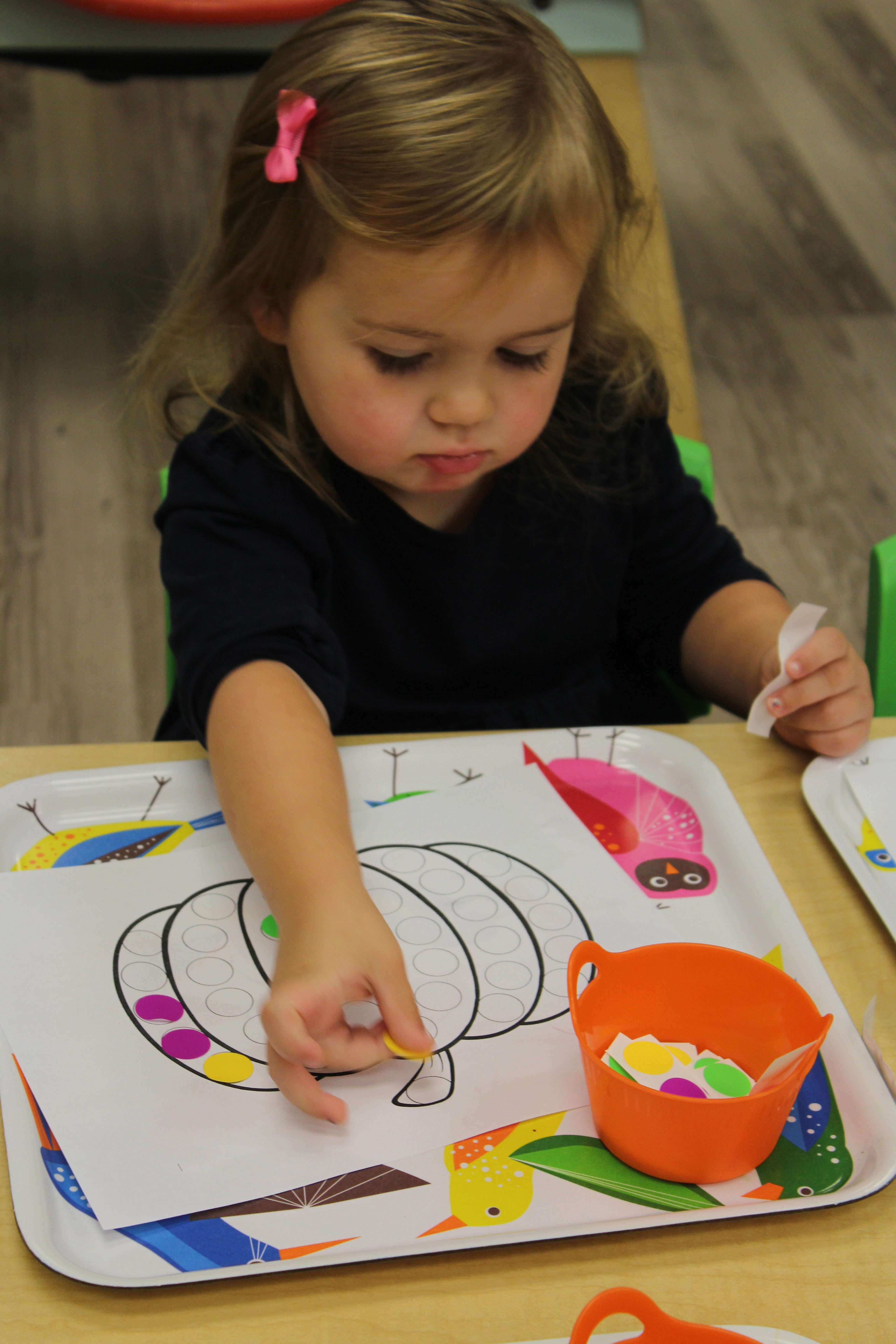 We have so much fun using paint dotters in the Toddler classroom. And this is a great activity to strengthen their fine motor and hand-eye coordination skills.