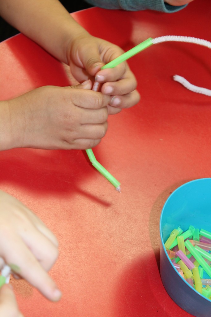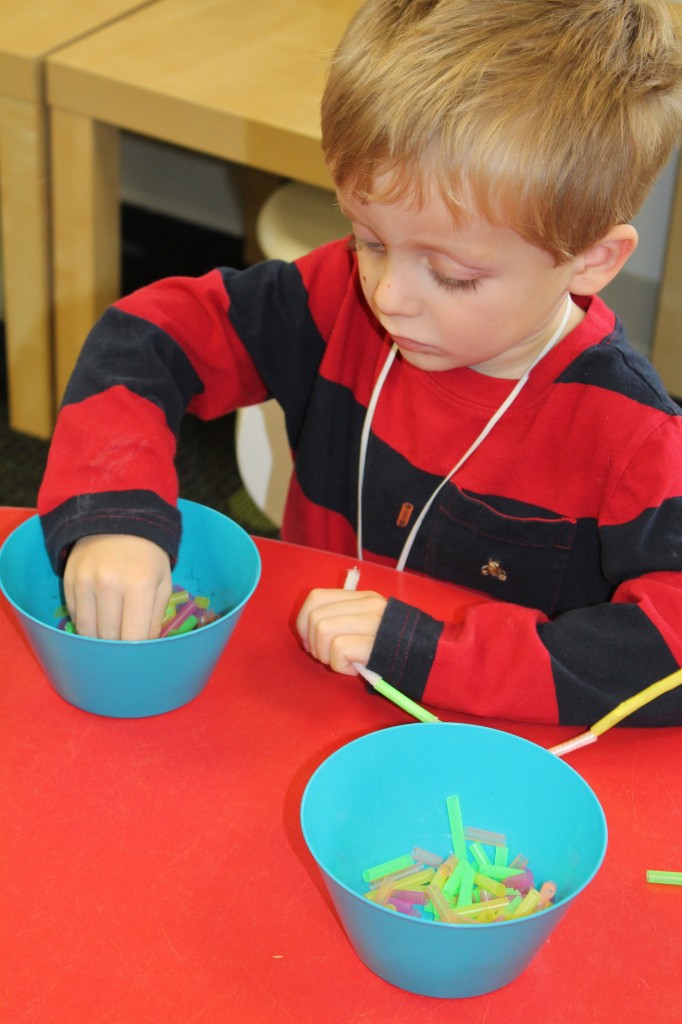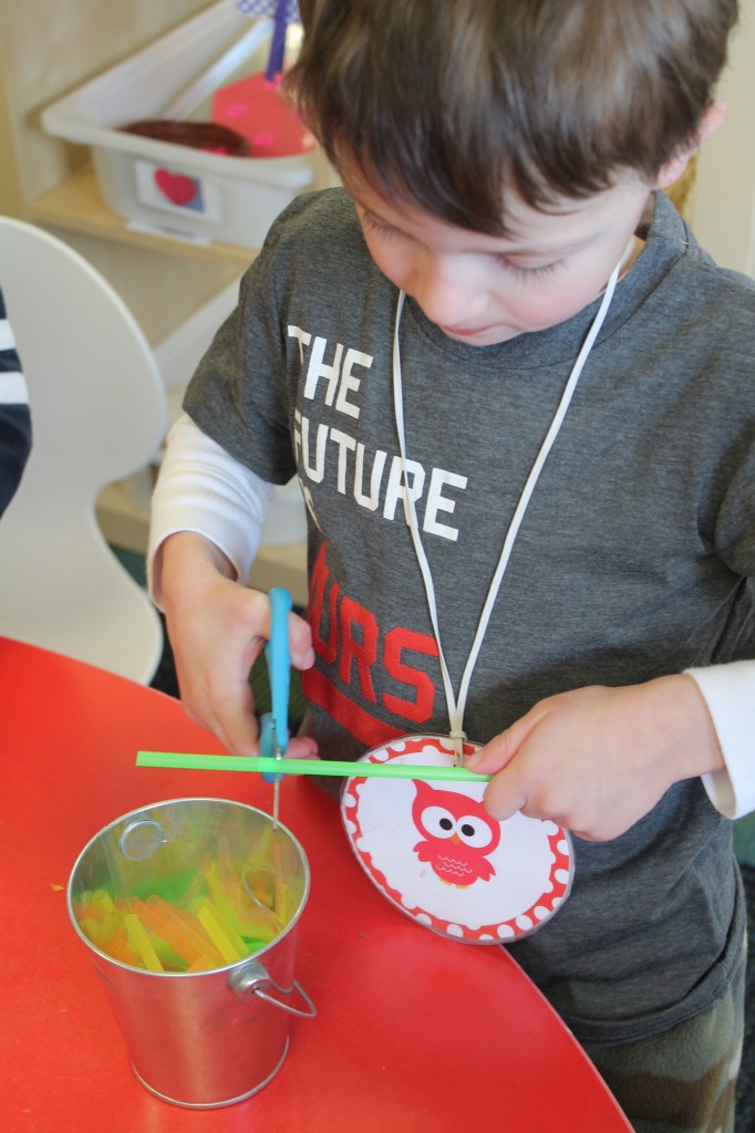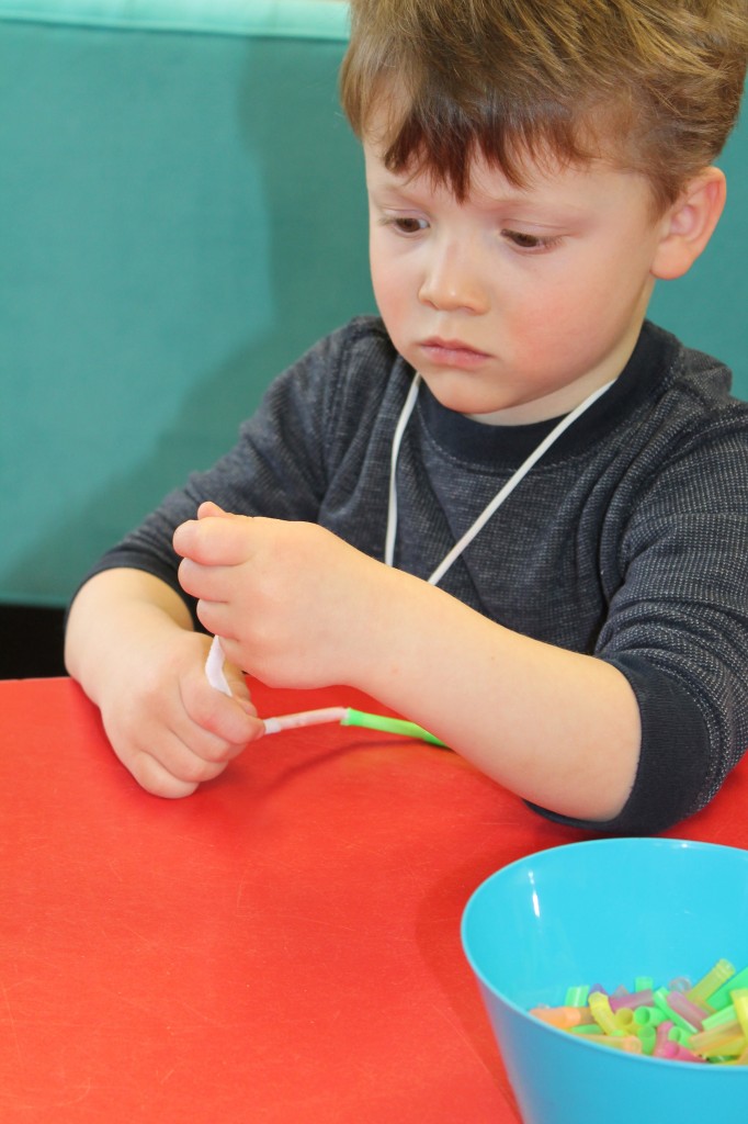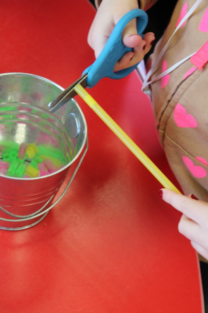 On Monday the preschoolers practiced their scissor skills. We talked about the correct way to hold scissors (two fingers in the bottom hole, one in the top, thumb always facing up), we strengthened our fine motor muscles by snipping straws. Cutting materials other than paper is a great way to develop those tiny muscles. Straws, pipe cleaners, brown bags, pasta, playdough, and other household items are great to use. This morning we used these straw bits to thread pipe cleaners. The tiny pieces are awesome for working on the pincer grip. These activities are perfect for handwriting basics. Have fun exploring ways to develop fine motor muscles at home!