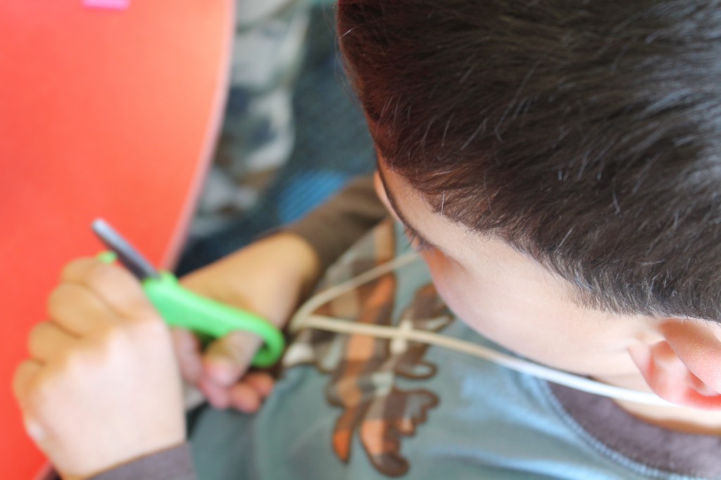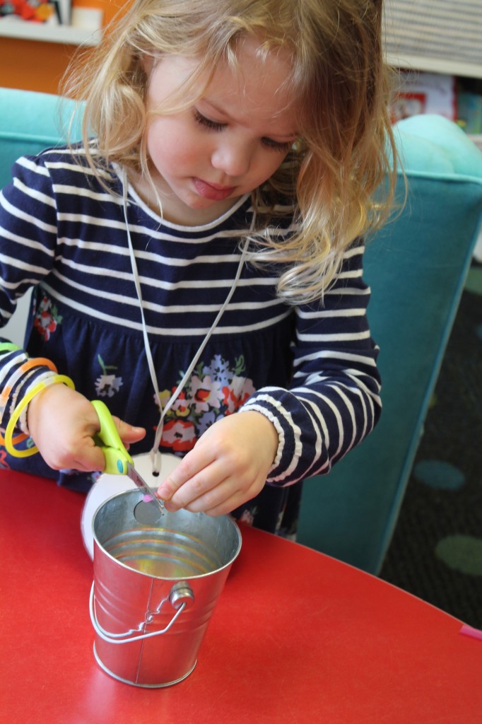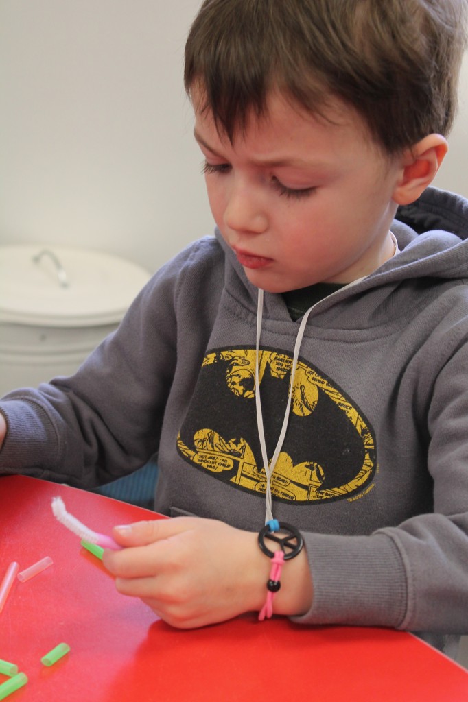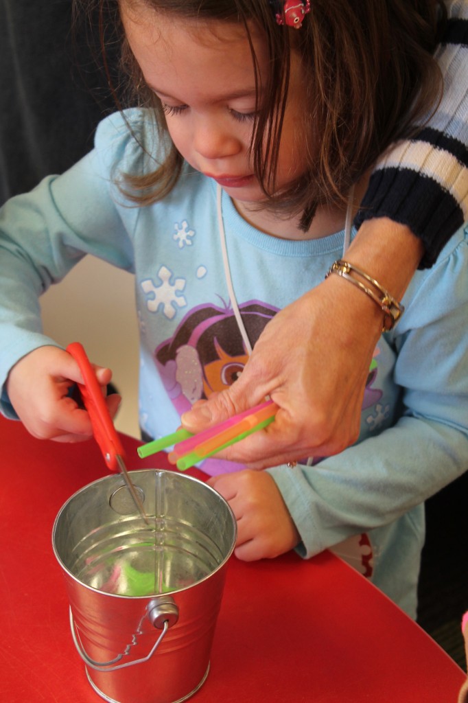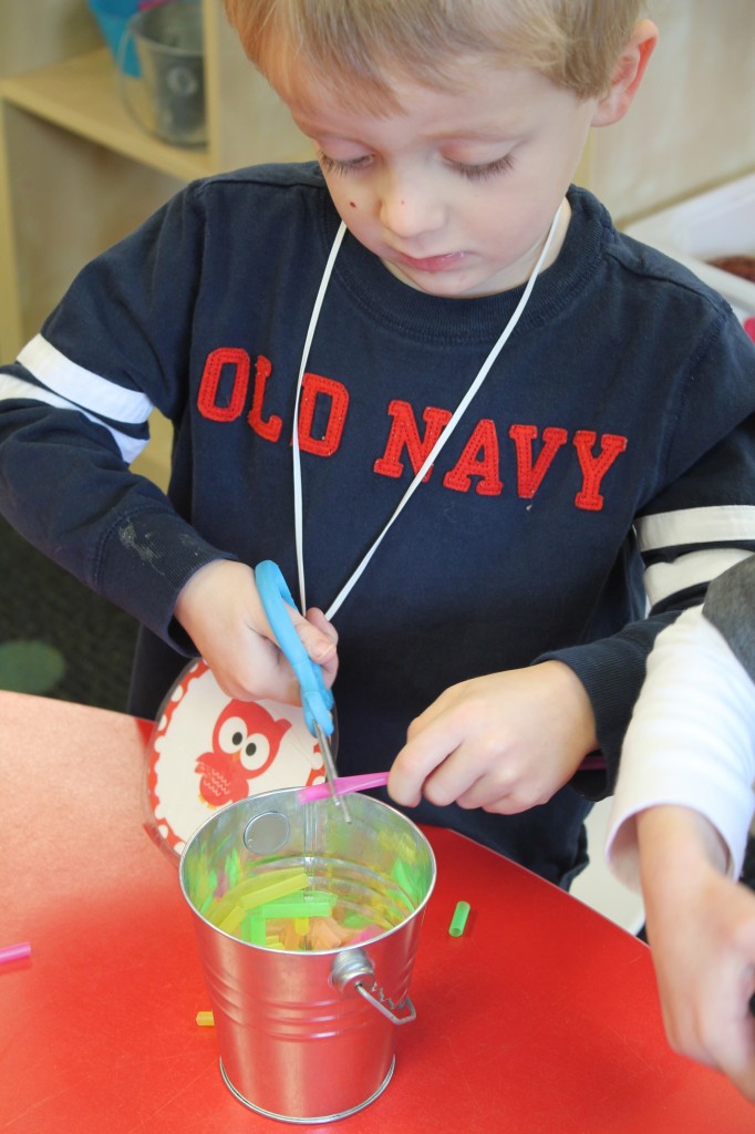 On Monday the preschoolers practiced their scissor skills. We talked about the correct way to hold scissors (two fingers in the bottom hole, one in the top, thumb always facing up), we strengthened our fine motor muscles by snipping straws. Cutting materials other than paper is a great way to develop those tiny muscles. Straws, pipe cleaners, brown bags, pasta, playdough, and other household items are great to use. This morning we used these straw bits to thread pipe cleaners. The tiny pieces are awesome for working on the pincer grip. These activities are perfect for handwriting basics. Have fun exploring ways to develop fine motor muscles at home!
