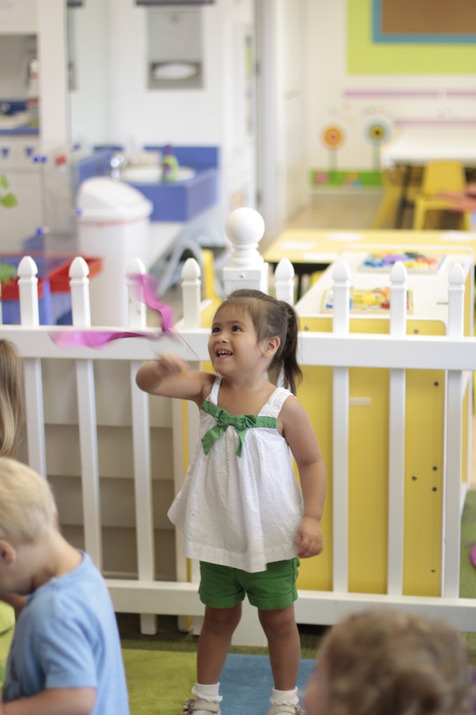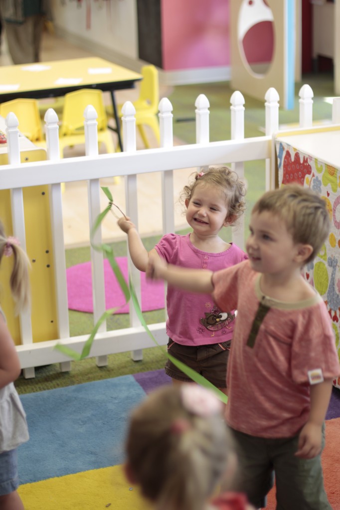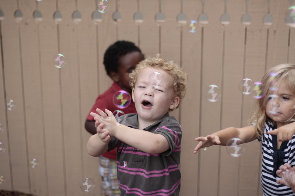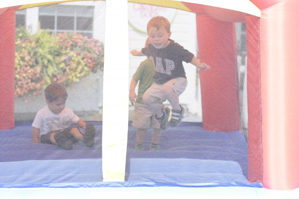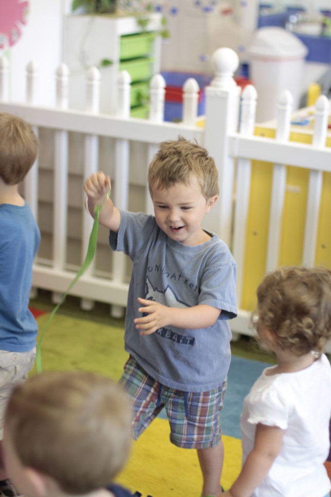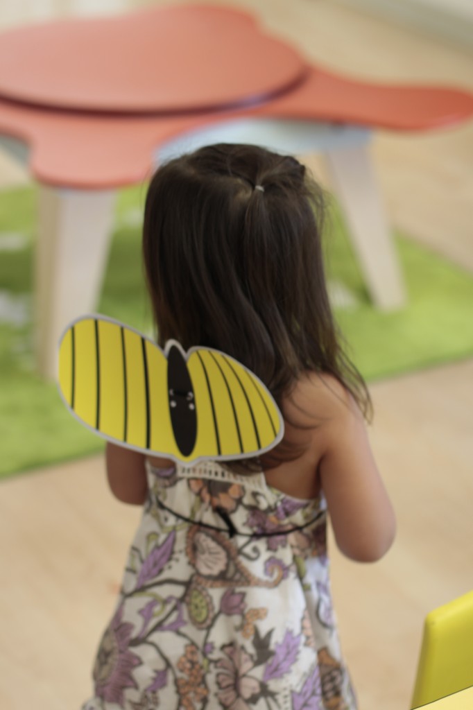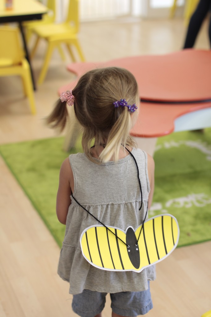 We continued our music theme for the week with exploring musical instruments, singing, dancing with ribbons, and so on! We’ve had a lot of fun in the music center. Also, I brought in my guitar, and we sang together at the end of the day. Miss Kate taught the children a new song: “The Baby Bumblebee Song.” It was an instant hit! 🙂 The children also enjoyed the bee wings we made to go along with our “Flight of the Bumblebee” theme for day 3. Aside from the music theme for the week, the children had fun playing with bubbles and bouncing in the bouncy house.