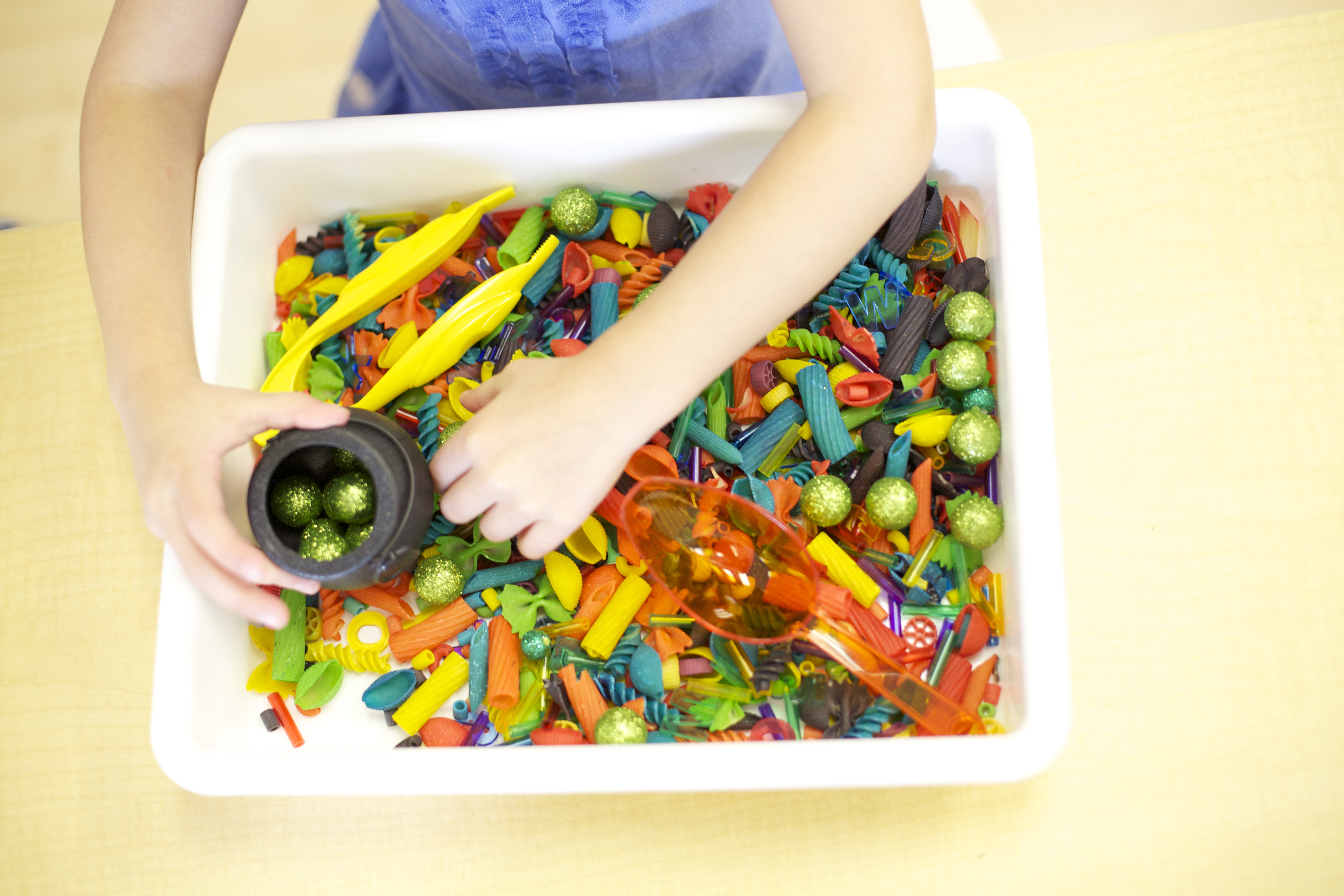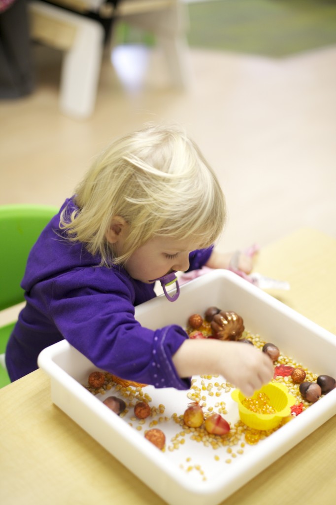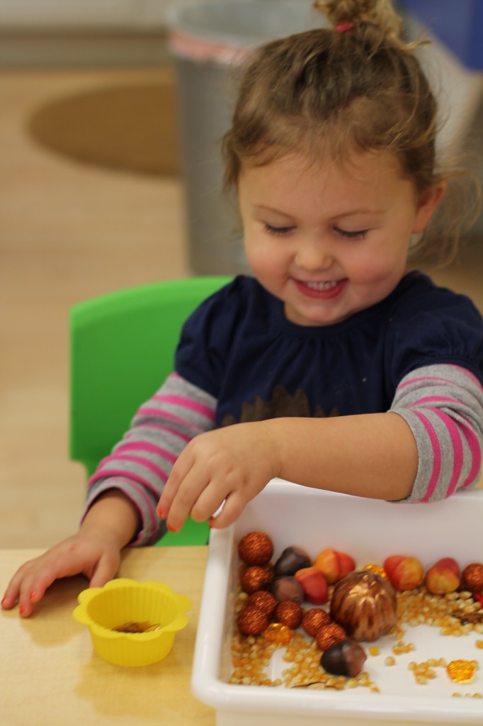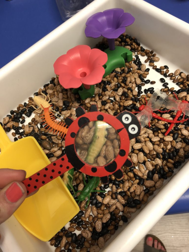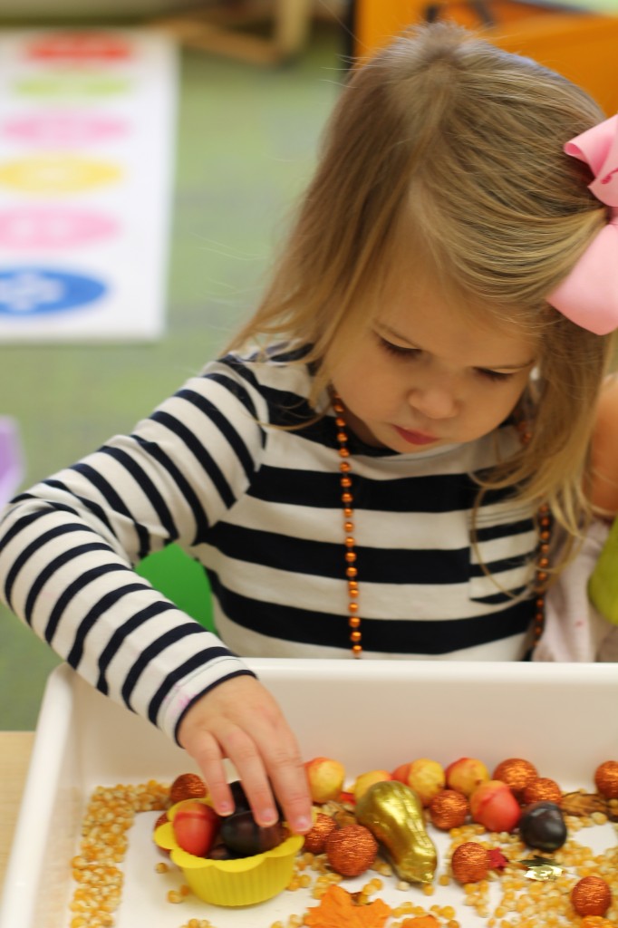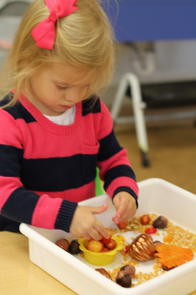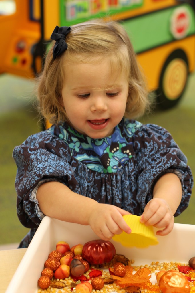 Sensory play supports language and cognitive growth, fine motor skills, and problem solving skills.  It aids in enhancing memory functioning and  is great for calming.  The sensory tub and discovery bins are popular in our room.  This is truly hands-on learning!
