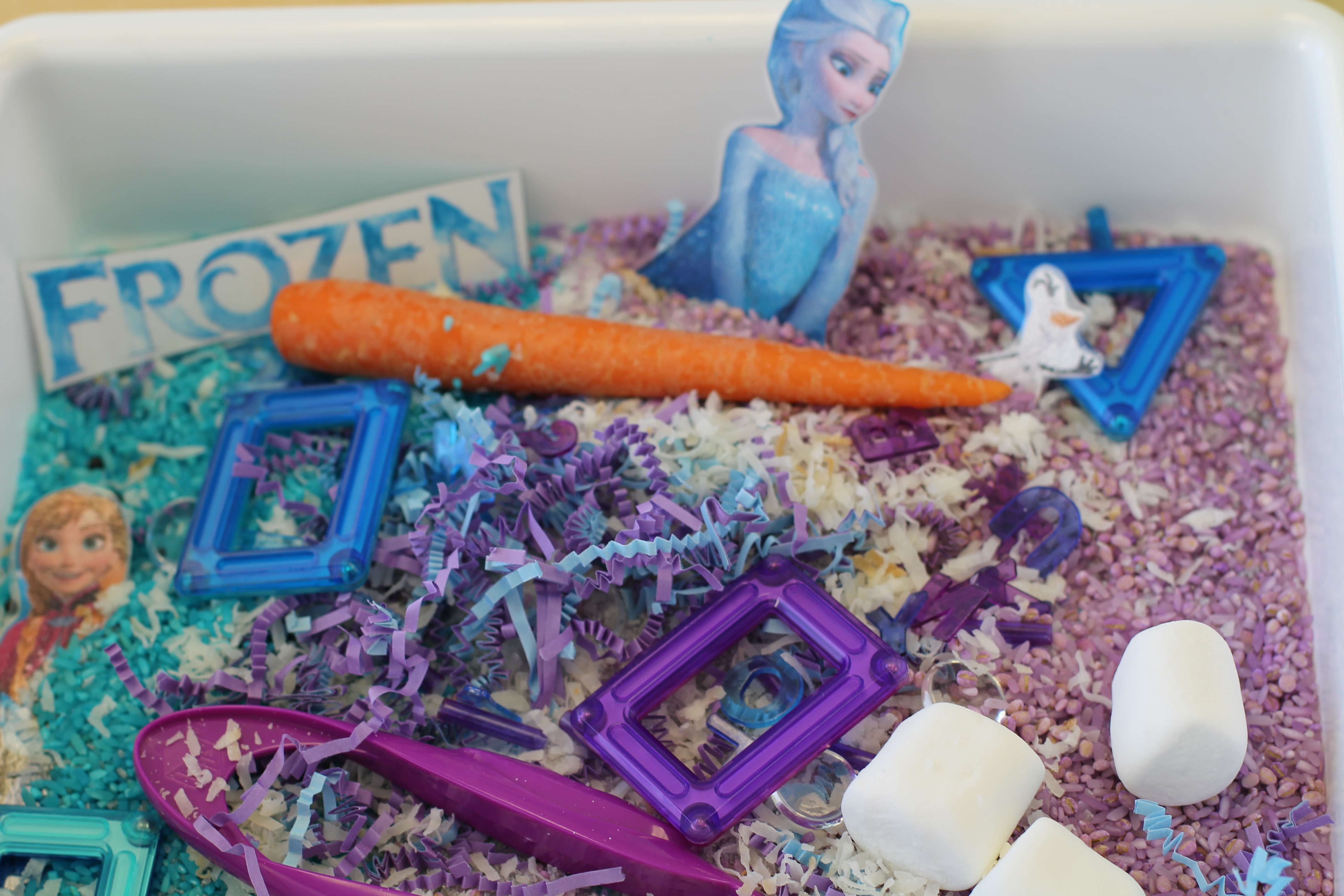 Our Sensory Tub looks just like a pond!  There are a lot of frogs hiding the blue water and green grass.