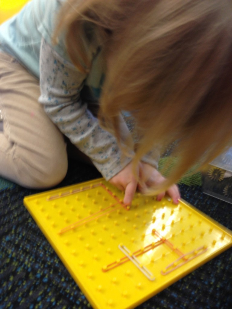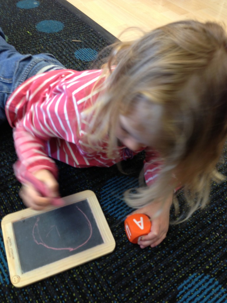 Paging through picture books in the classroom Library gives children the opportunity to tell their own story. Exposure to different types of print sparks a love for literature. “Reading” books at any age helps with comprehension even just by looking at the pictures. Letter recognition, letter sounds and the association between both concepts are developed while exploring books.