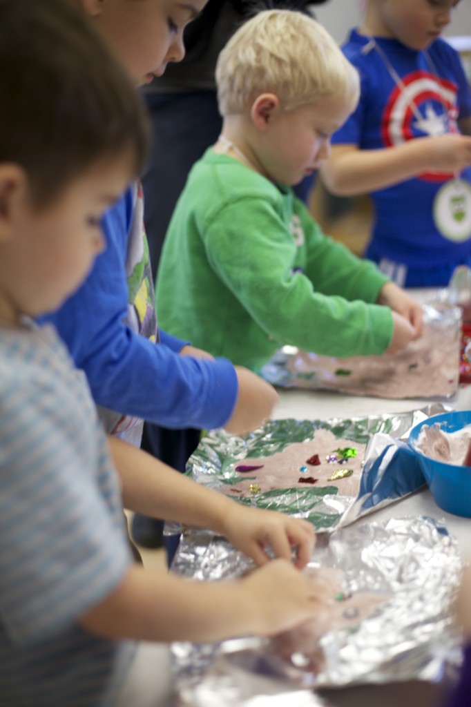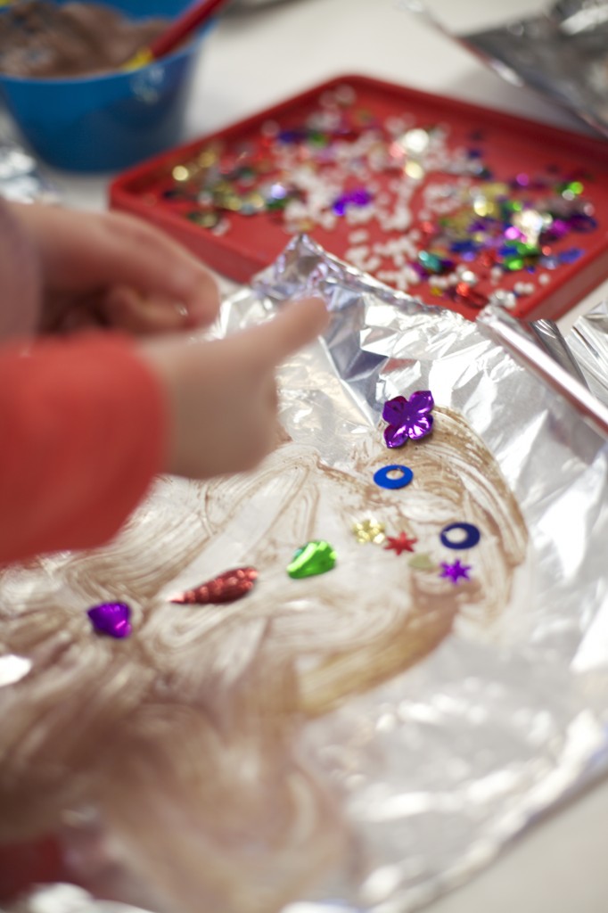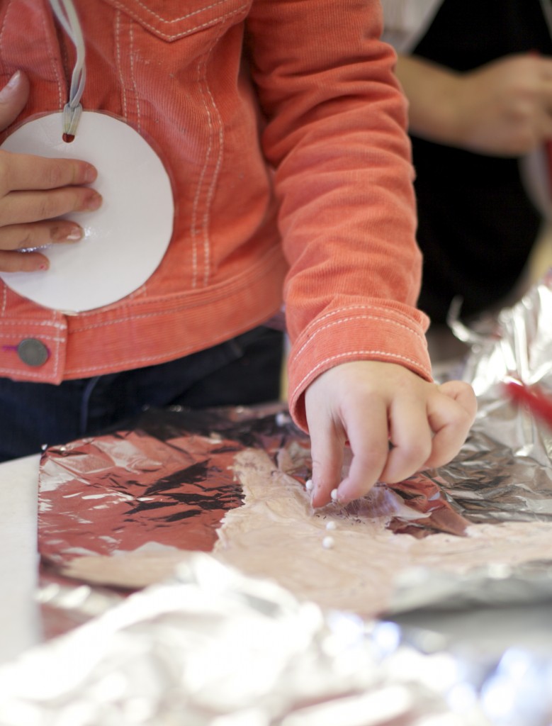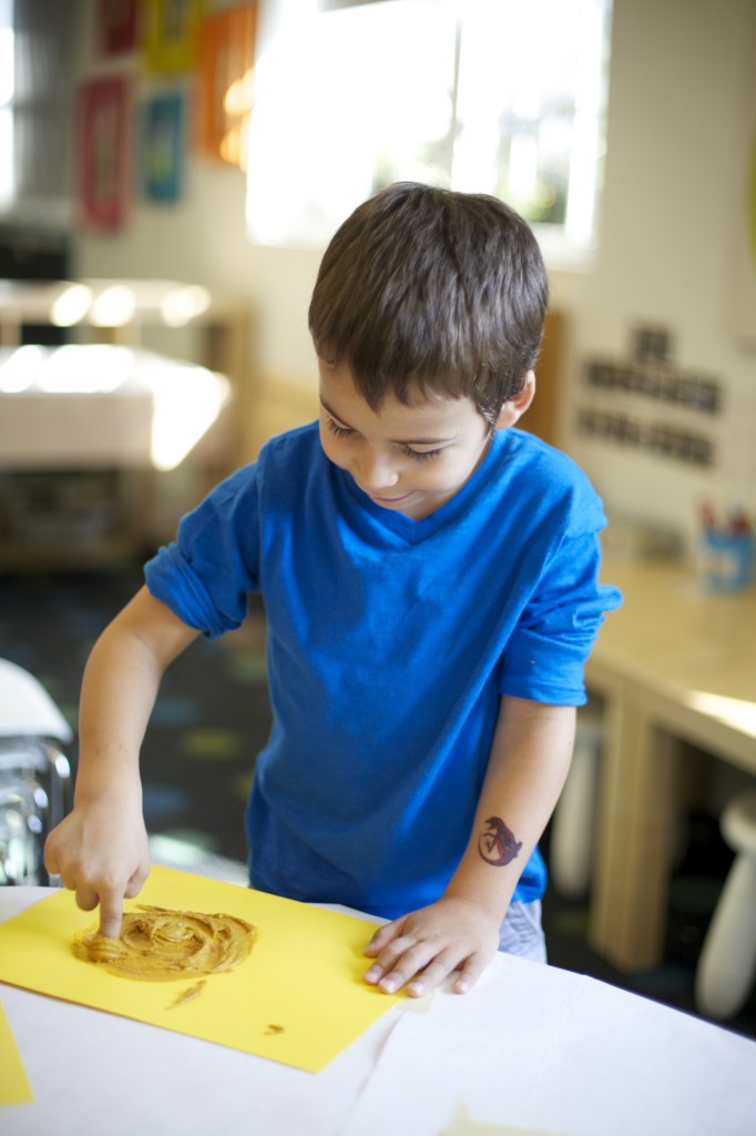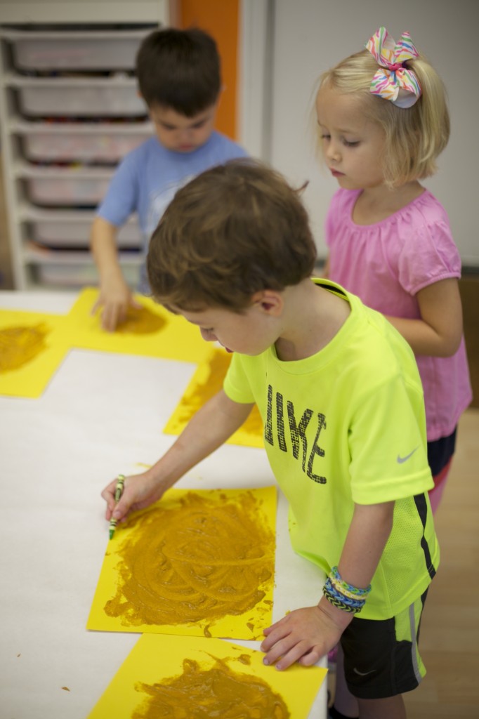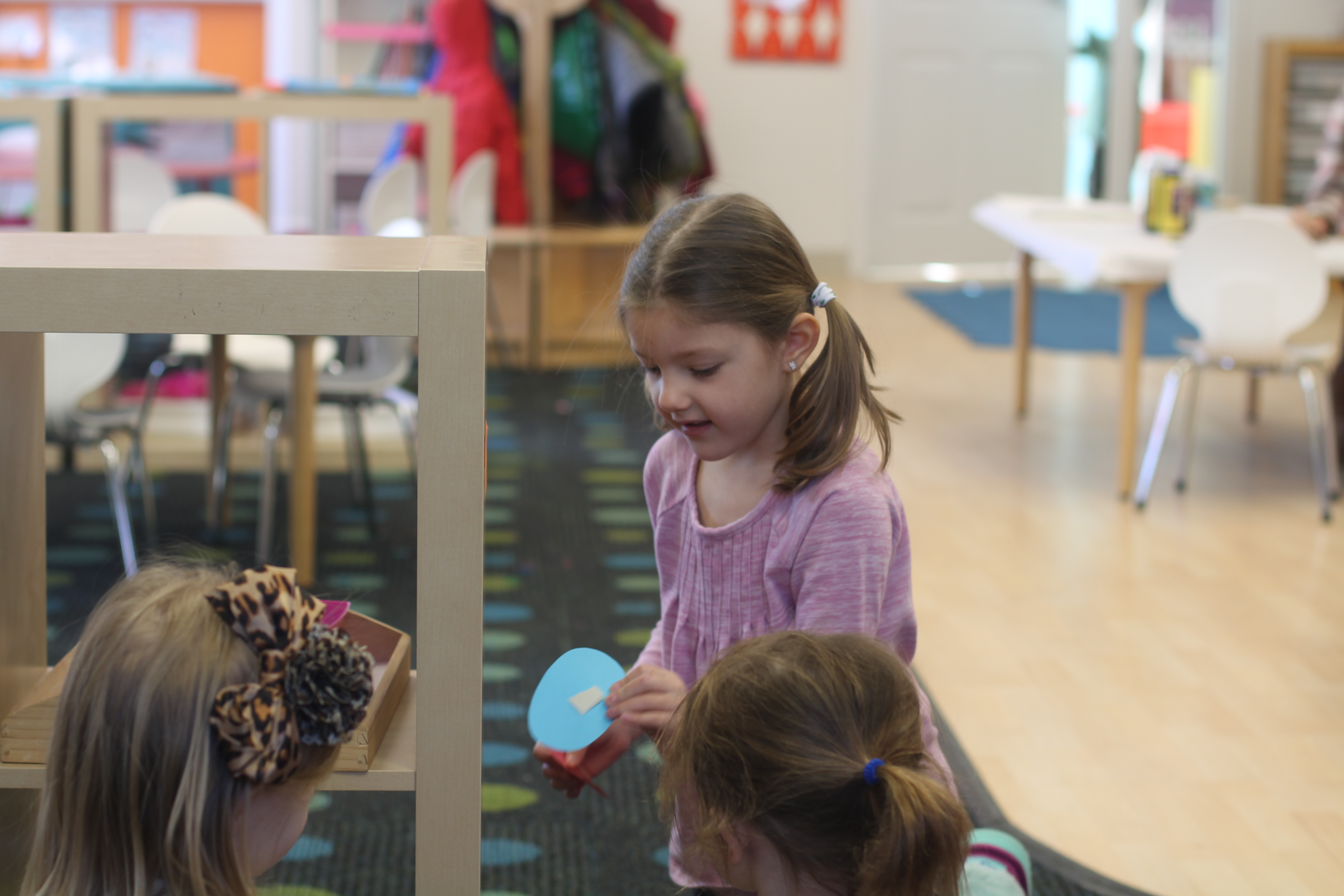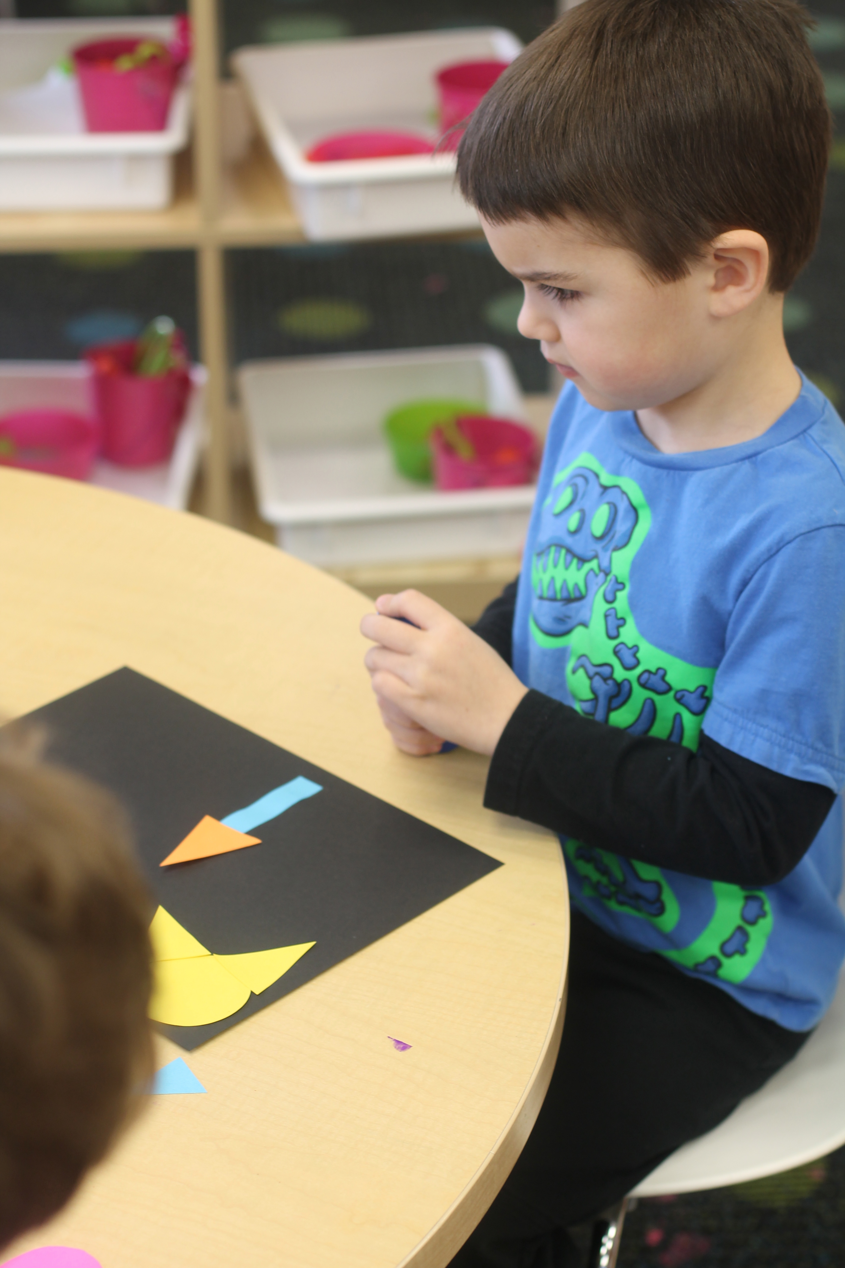 At our art center our friends practiced sticking tissue paper triangles onto contact paper on our easel.