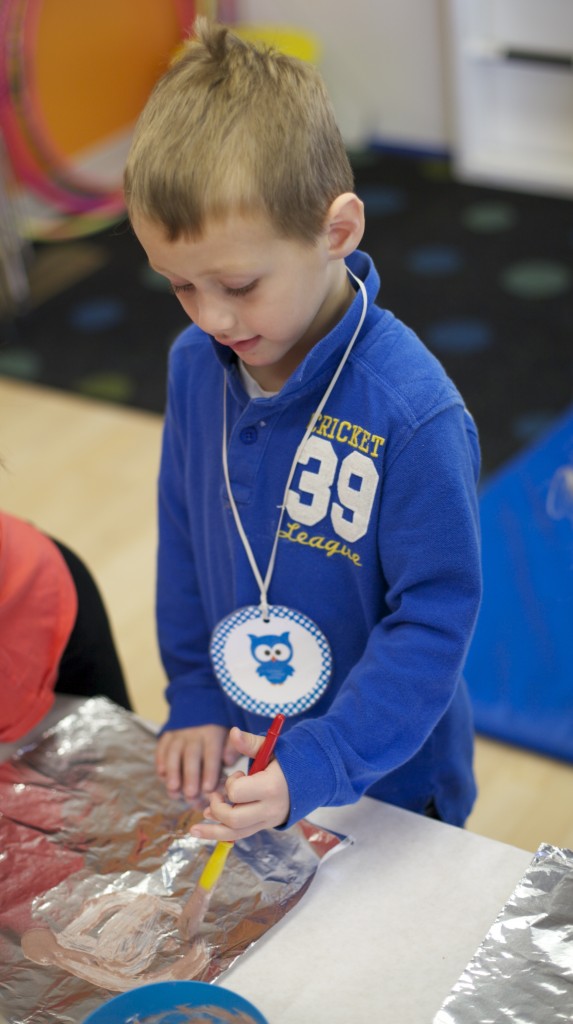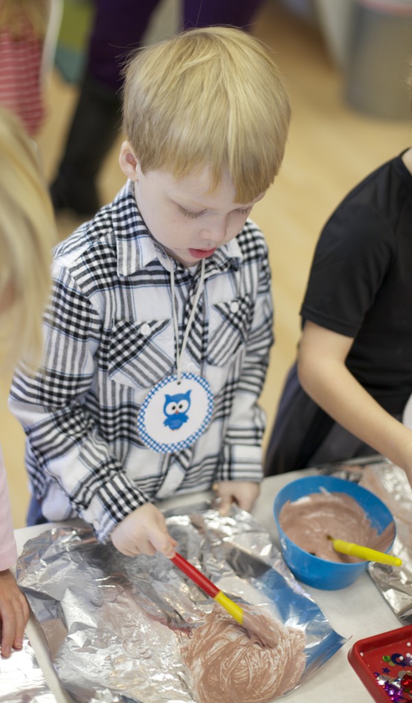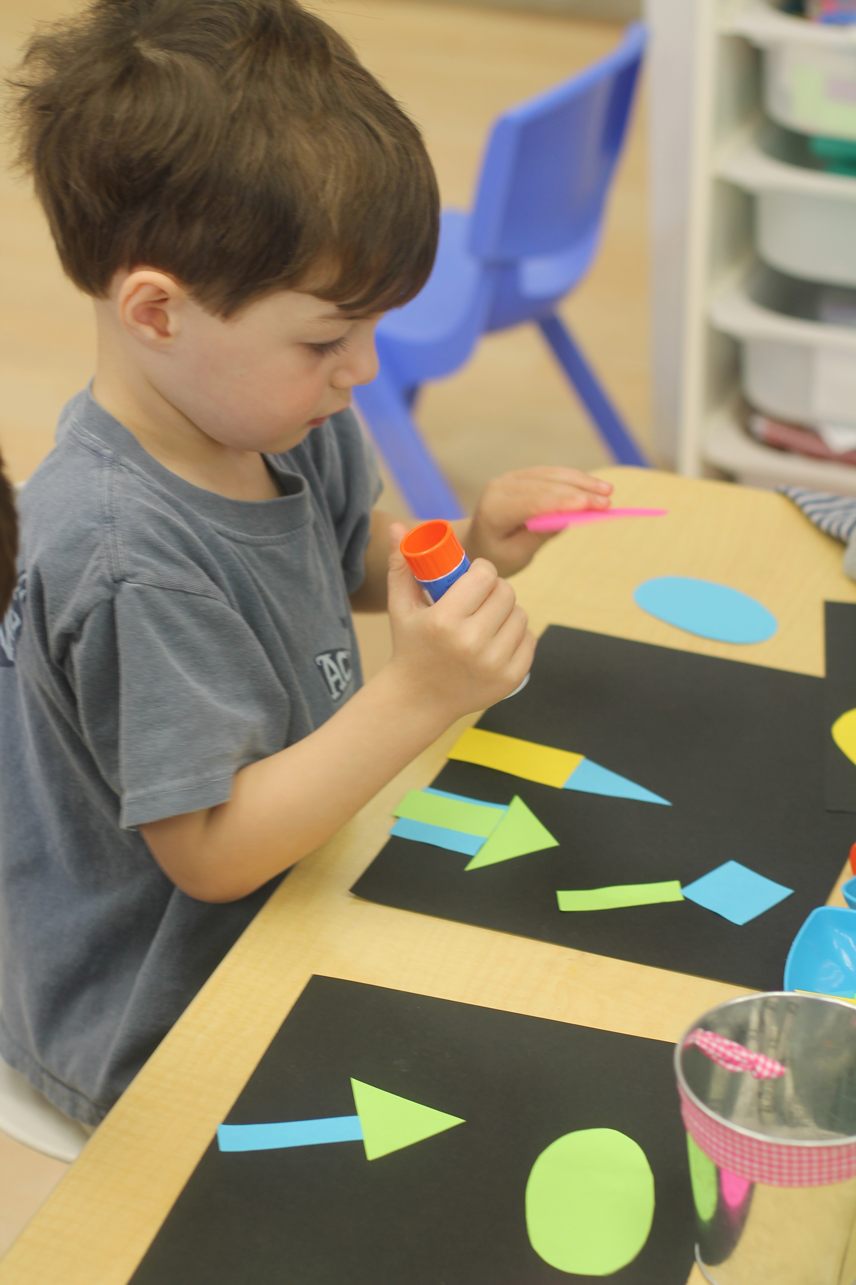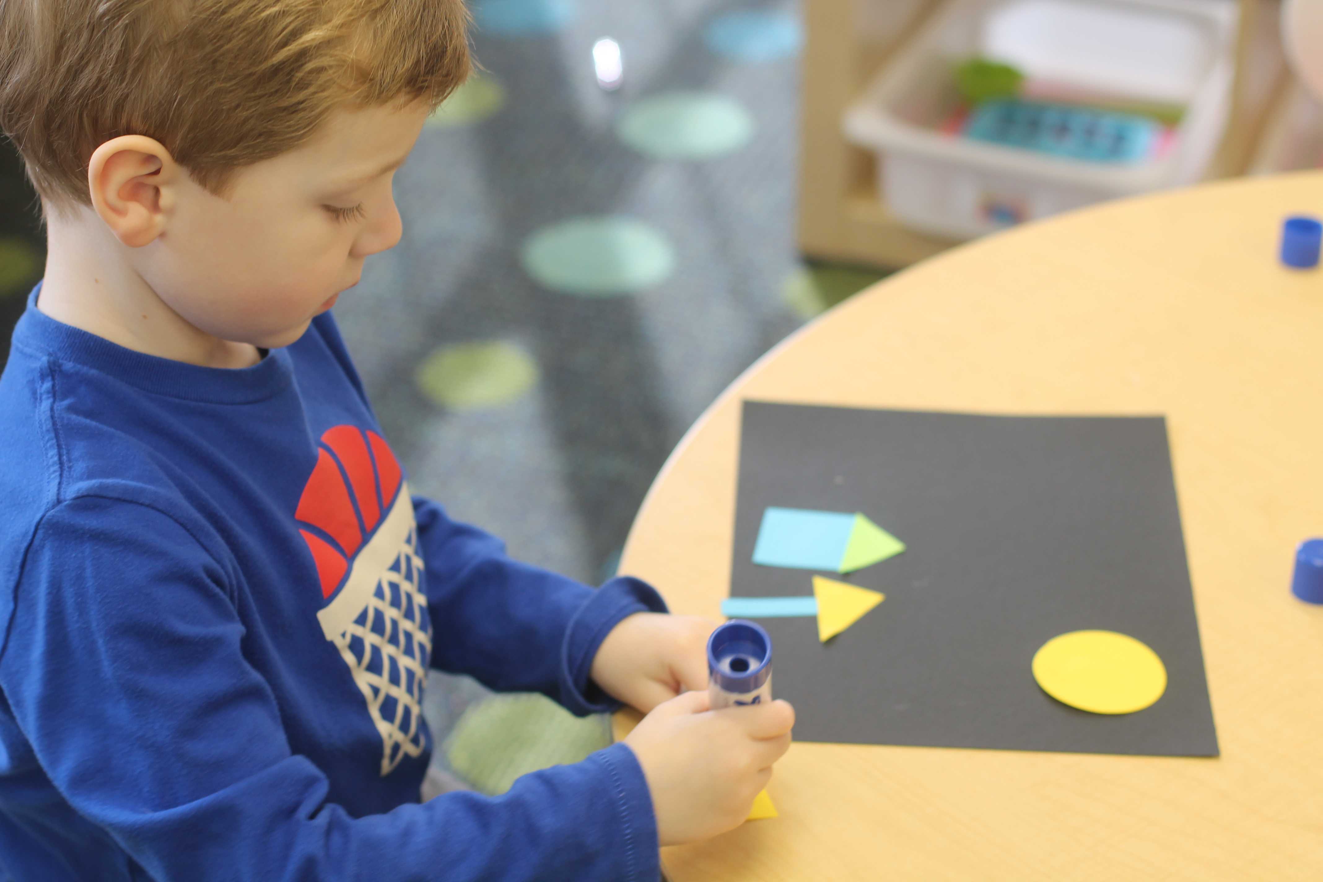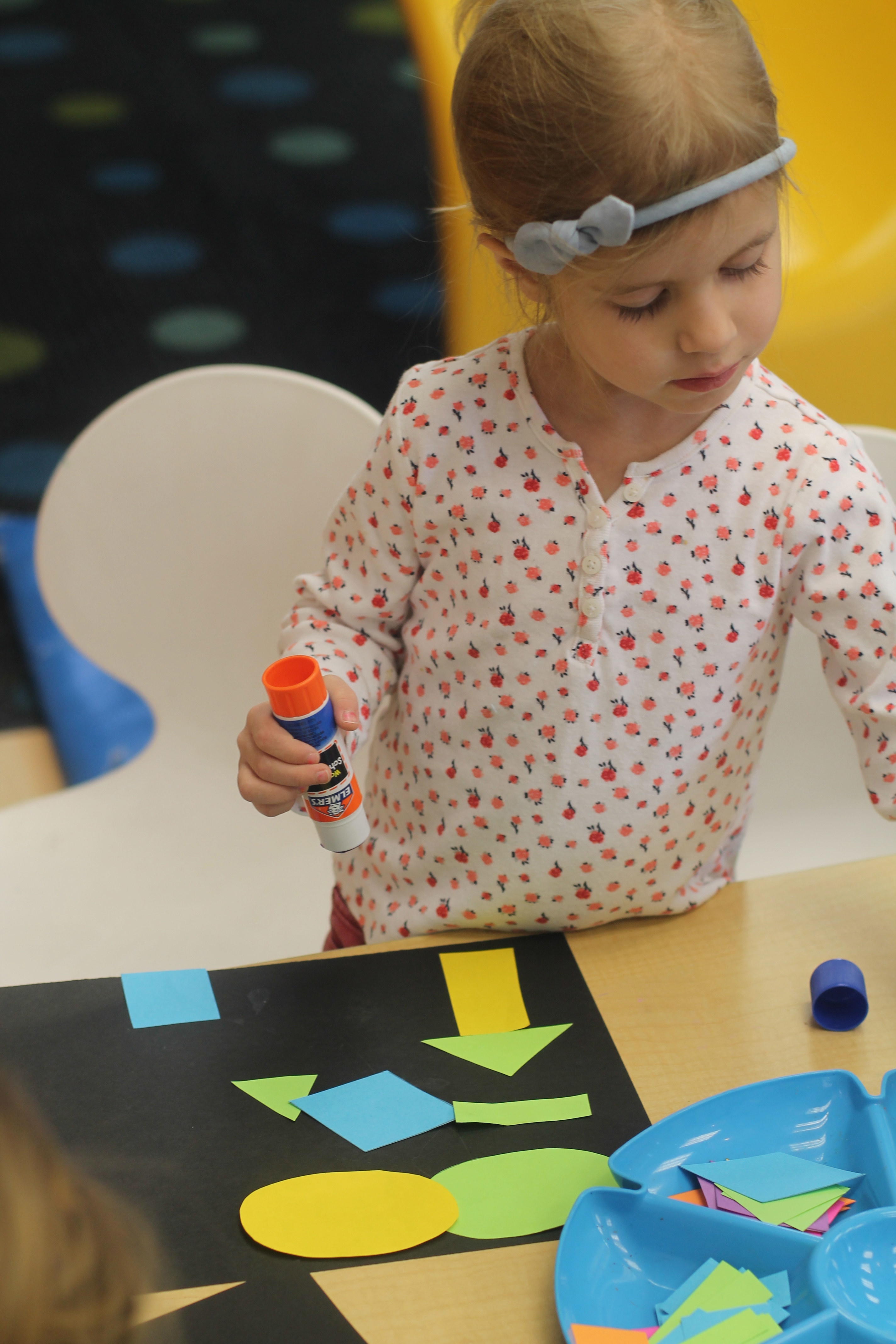 Our toddler friends practiced using a glue stick again in their art project with Ms. Kristen! They made owls using the triangle, too!