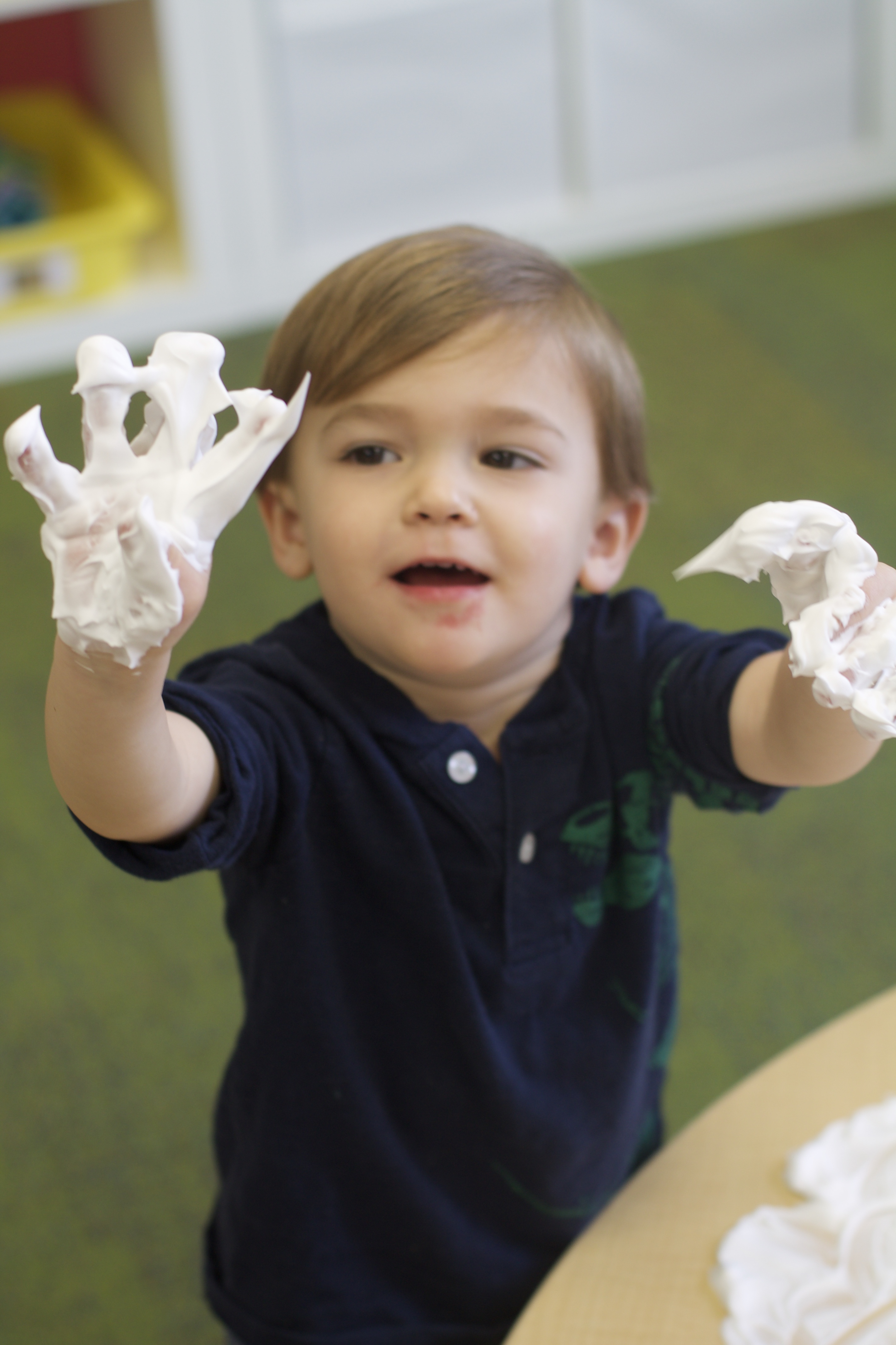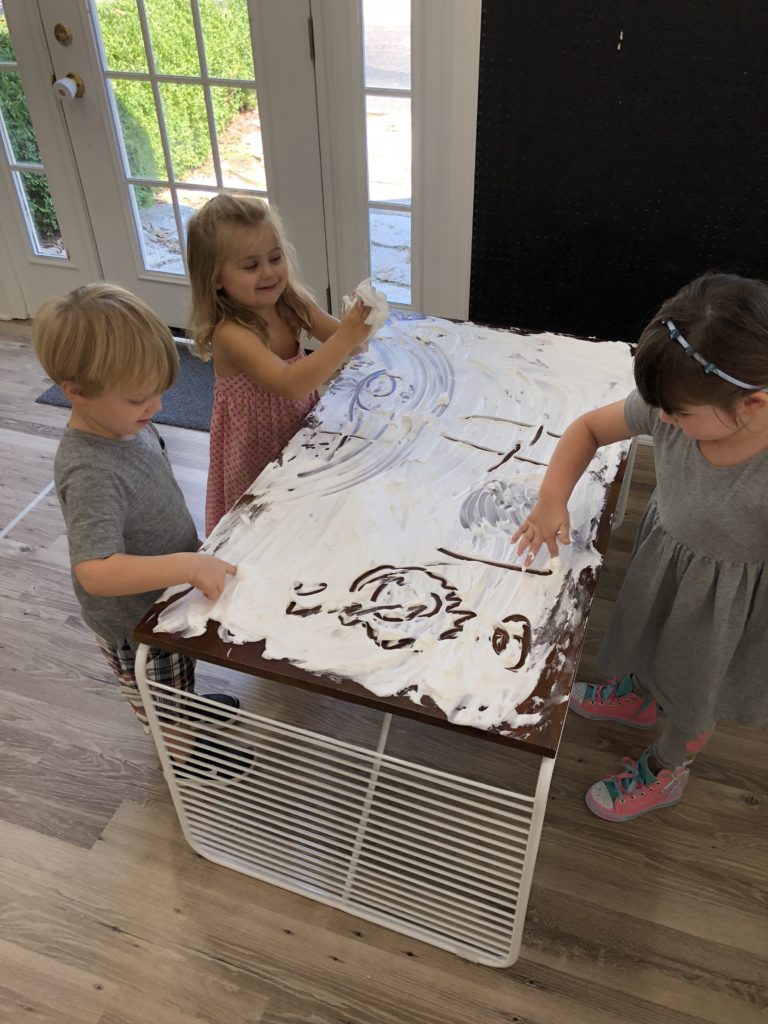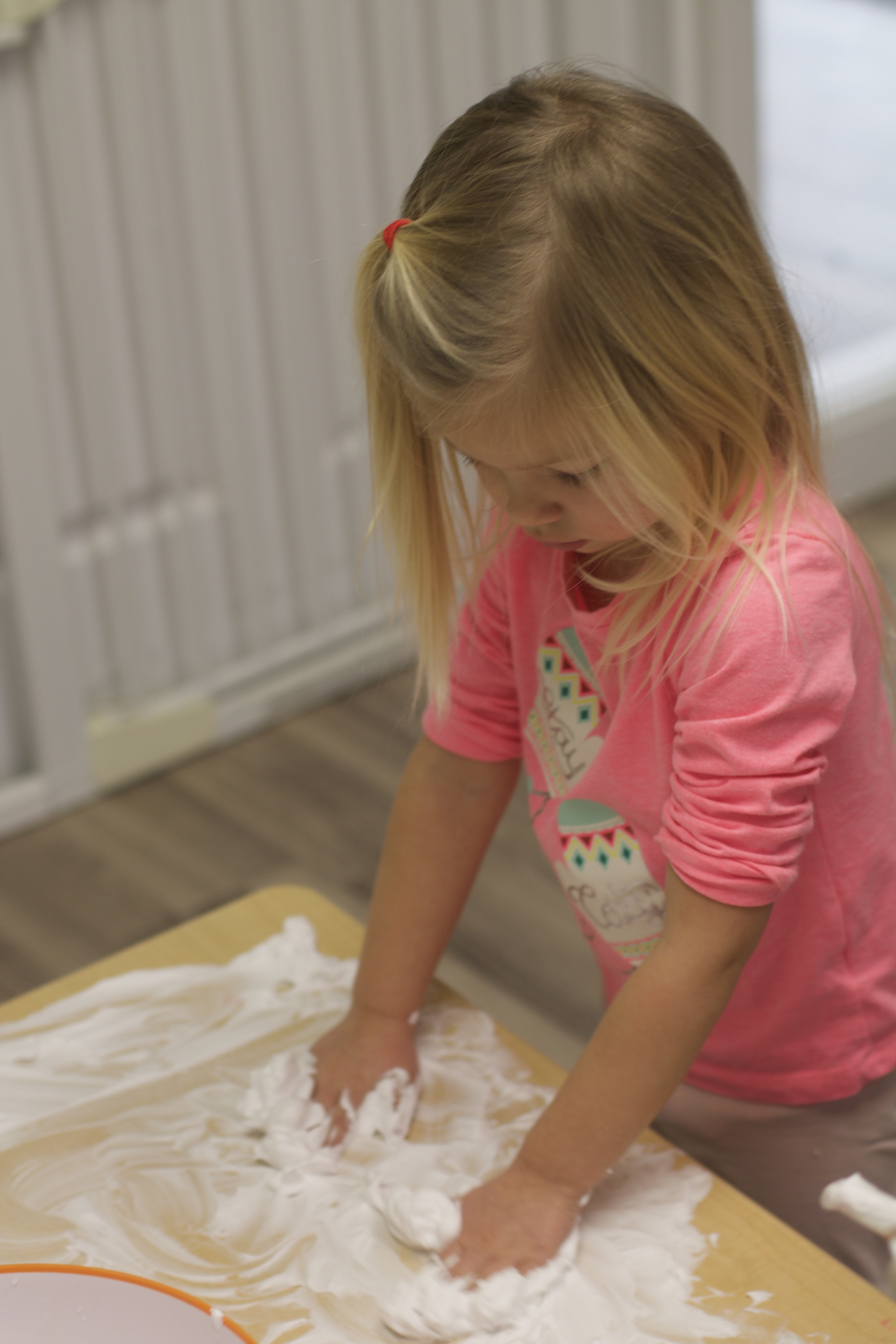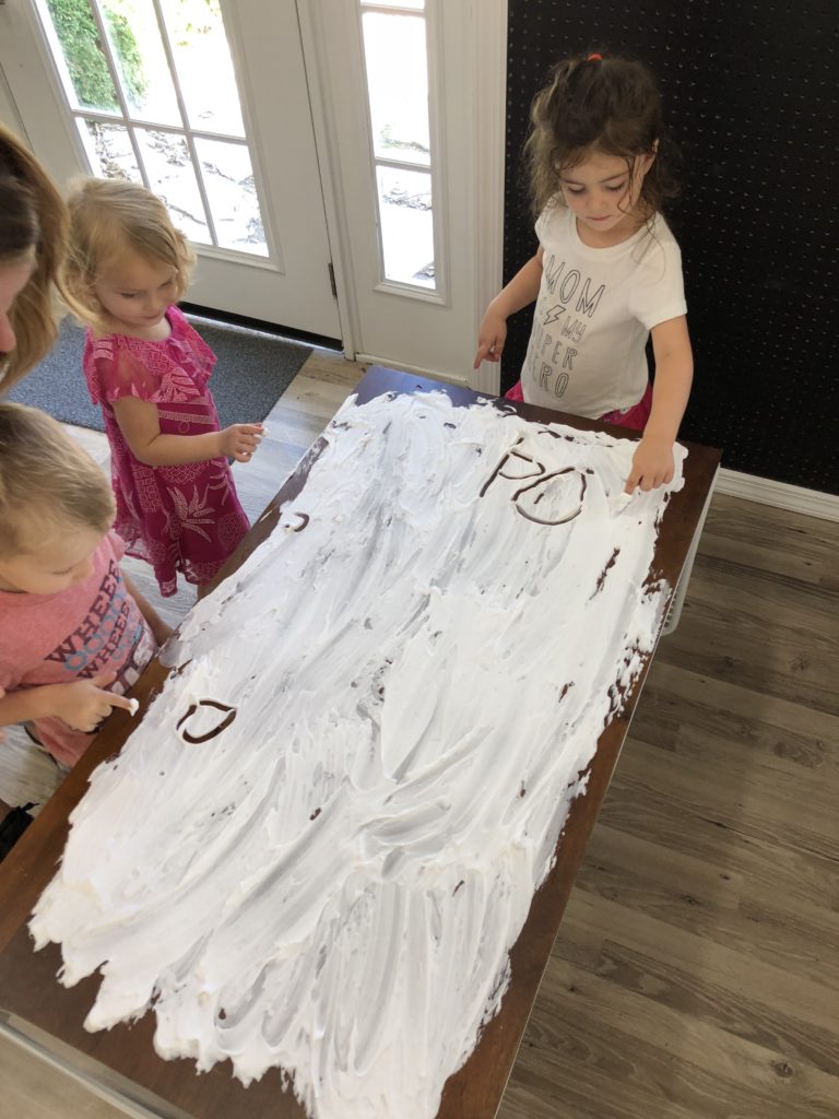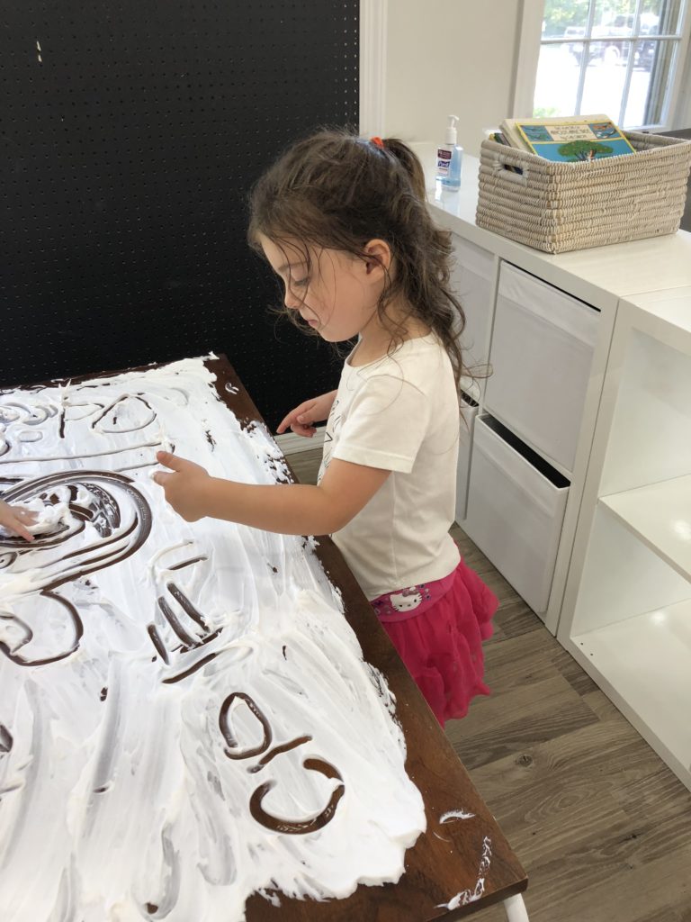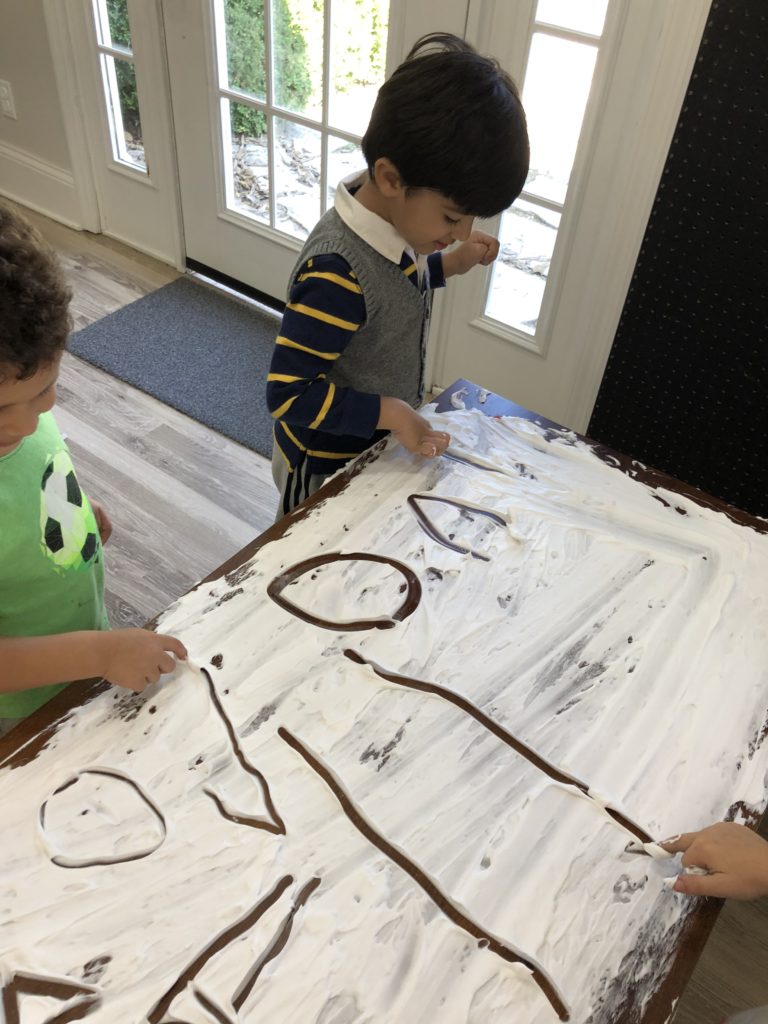 Shaving cream on the tables provided an interesting textured sensory activity. It also provides an empty canvas to practice drawing shapes, letters, and lines.