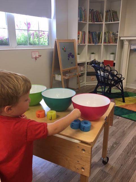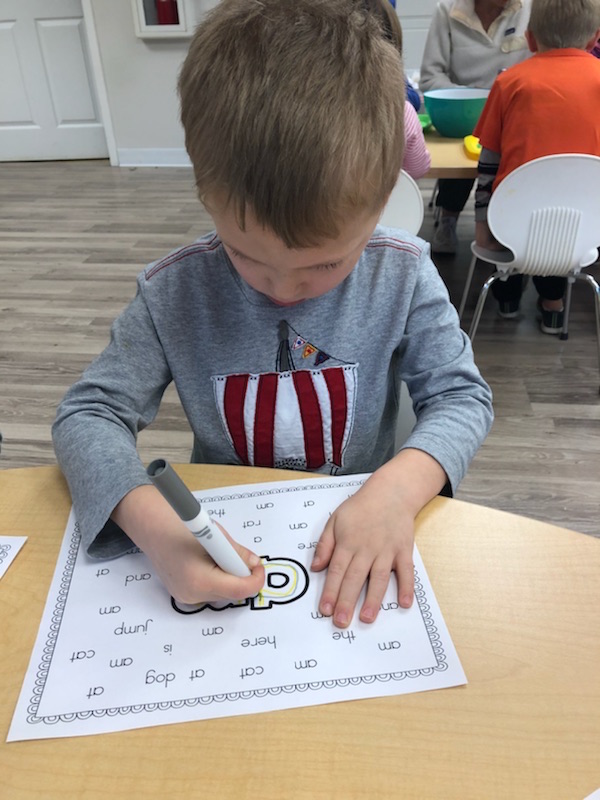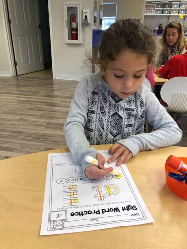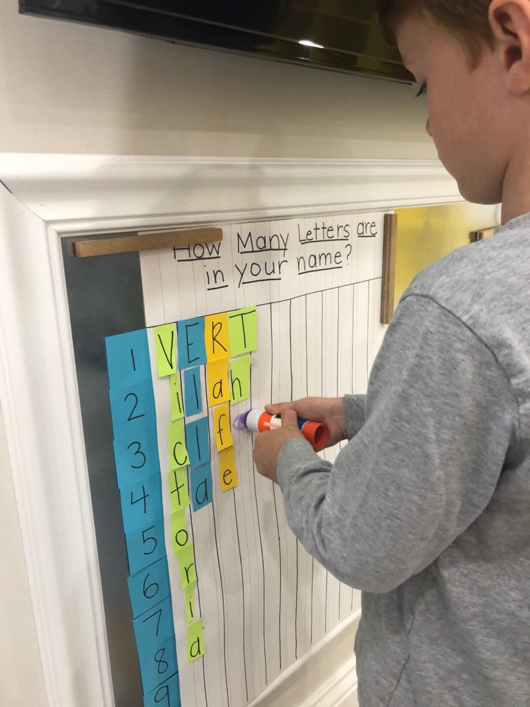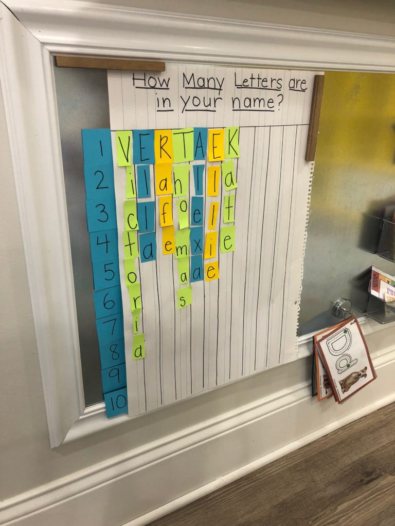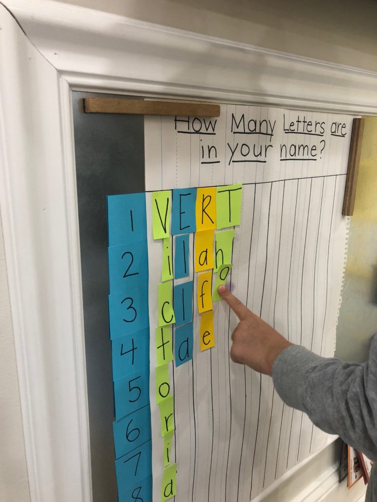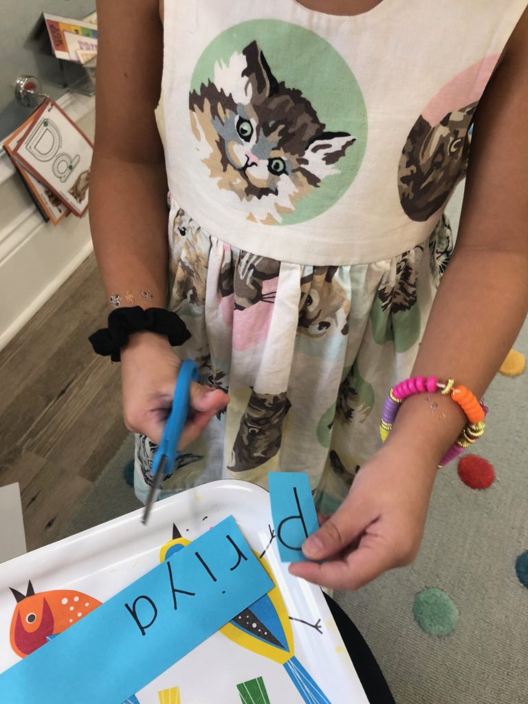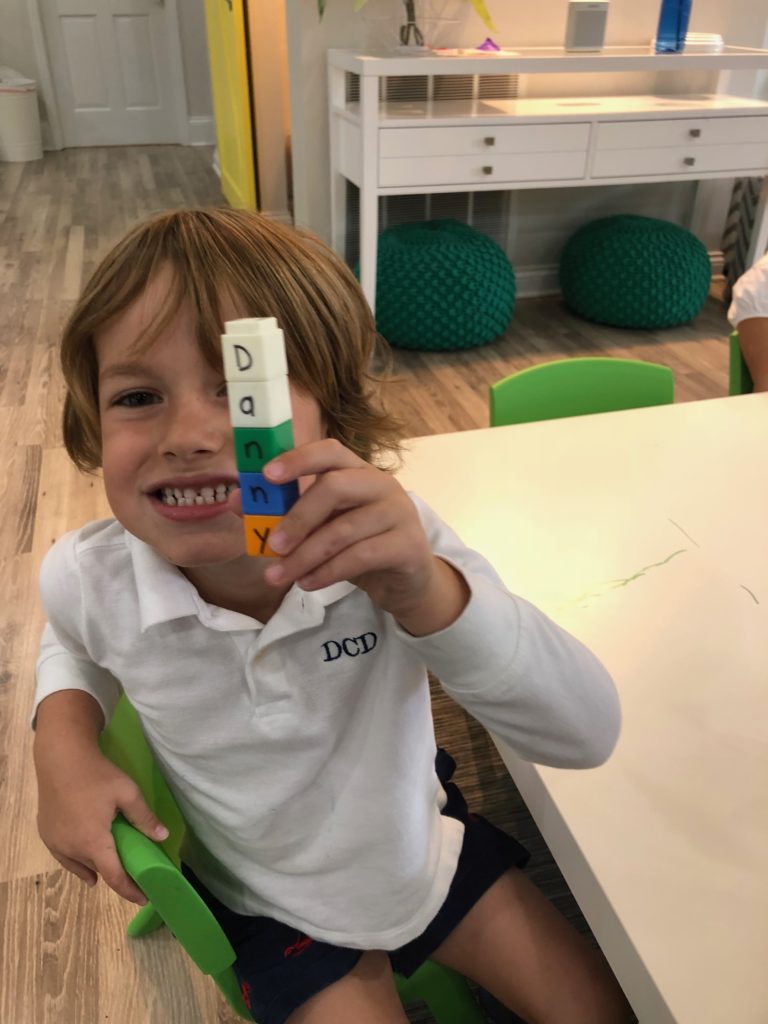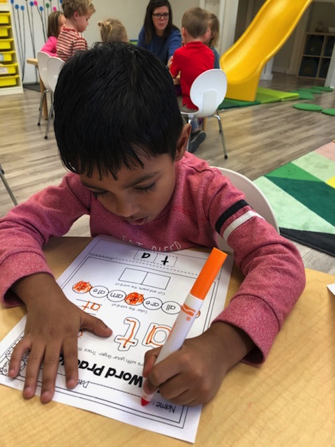 Letter and Word Awareness is the ability to identify individual written letters and words. Once children are able to identify printed letters, they develop the ability to identify entire words. The entire developmental progression from letter awareness to word awareness to fluent reading typically begins around age three with letter awareness and continues through age five, six or seven with fluent reading. Our K Prep class is beginning working on understanding that words are groups of letters separated by spaces on either side. Children’s names are the most important word to them, so what better place to start!
