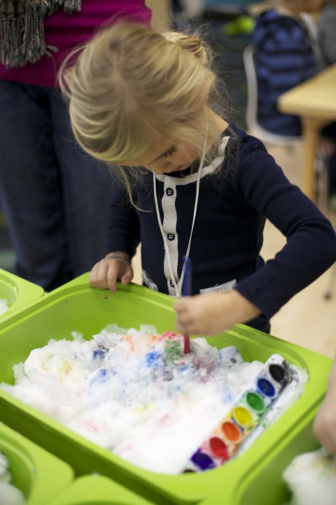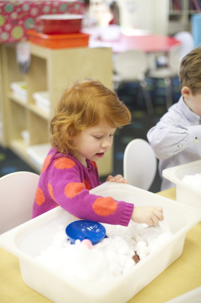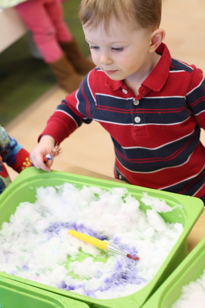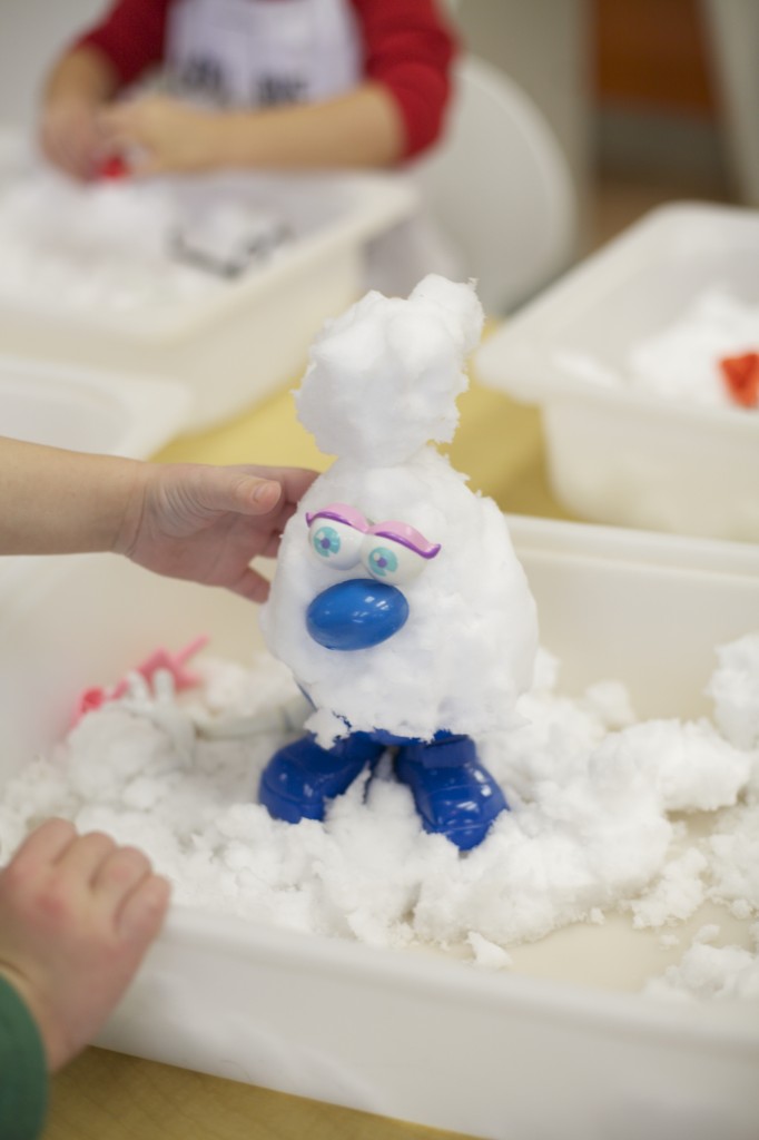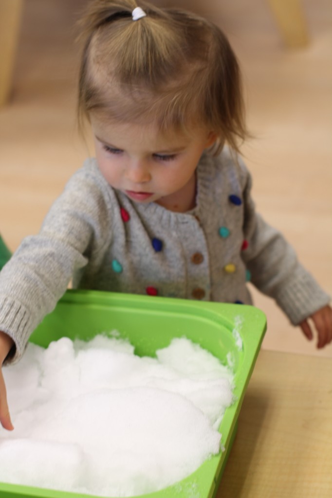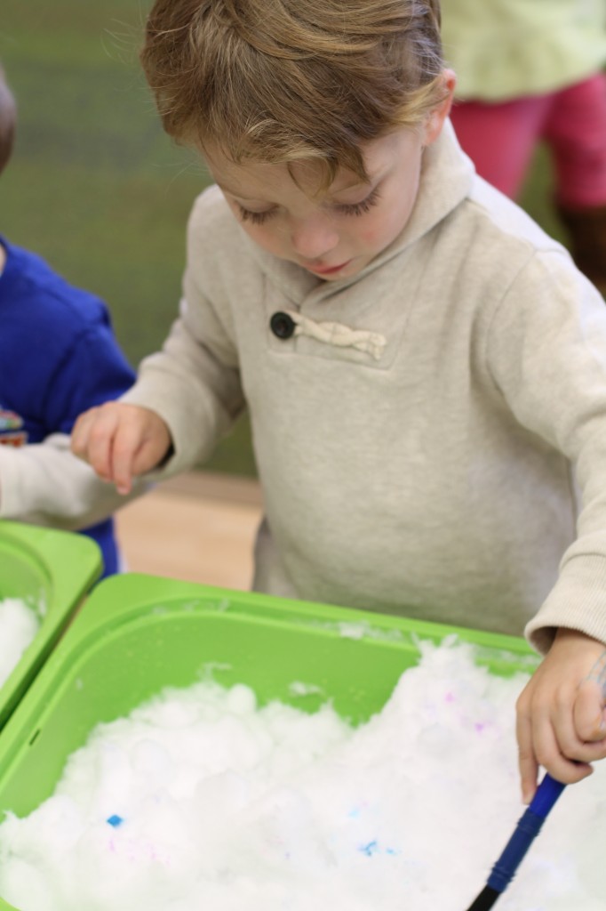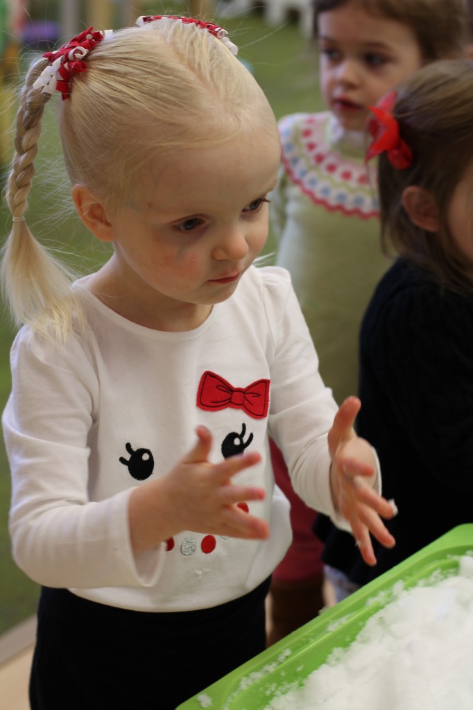 Happy New Year from the studio toddler room! The weather has kept us busy indoors this month but we have filled our days with crafts, discovery bins, winter centers, stories, dancing, and learning through play. Our color focus is white and our shape is the triangle so we incorporated these focus targets into most of our centers, small groups, whole group and purposeful play.