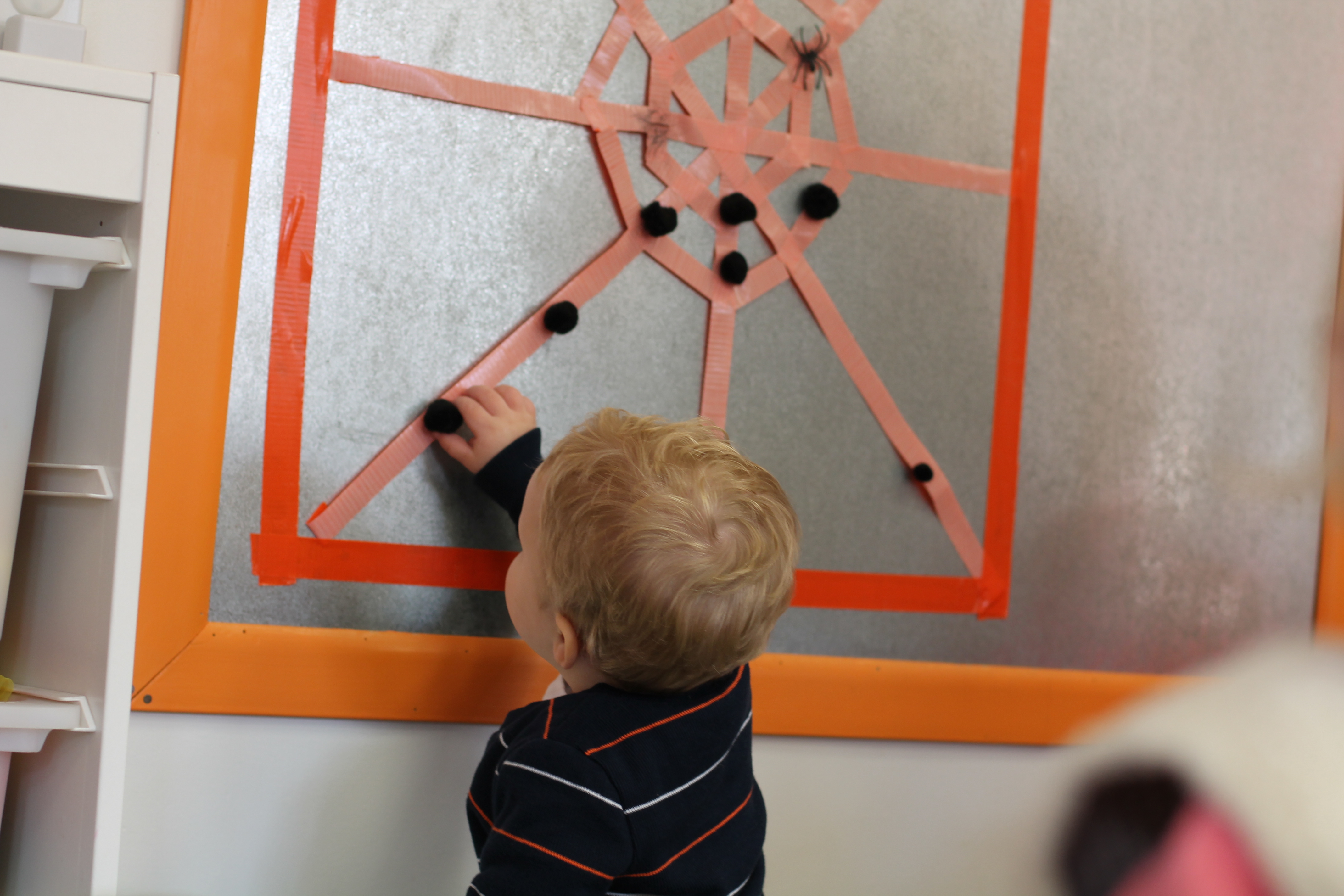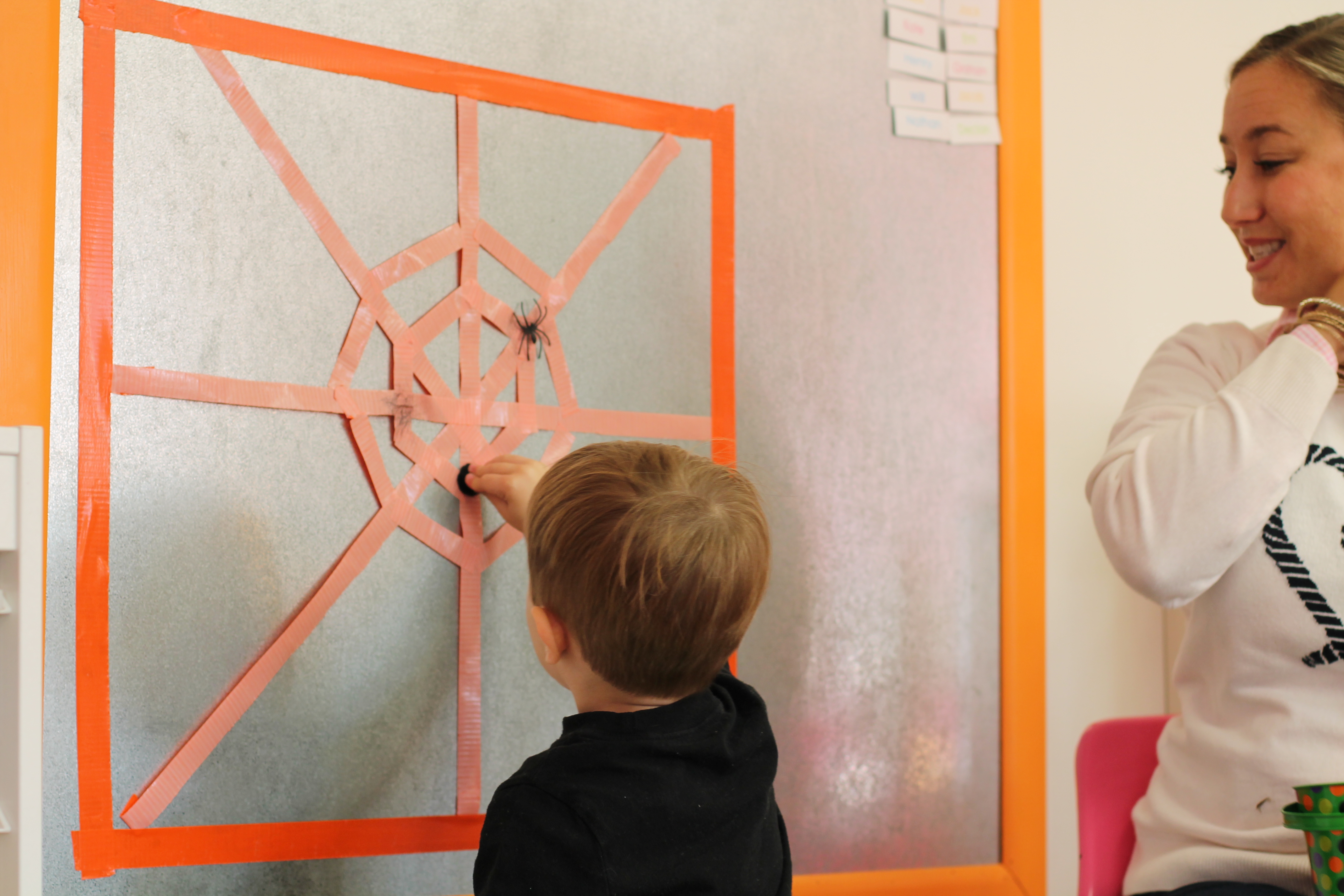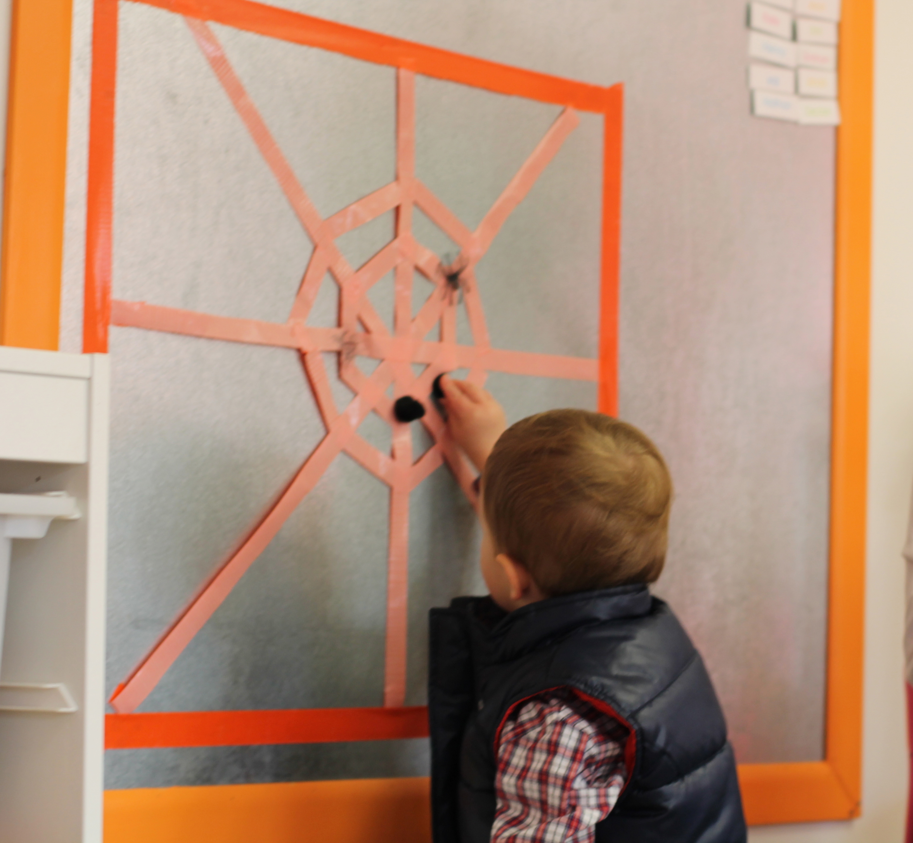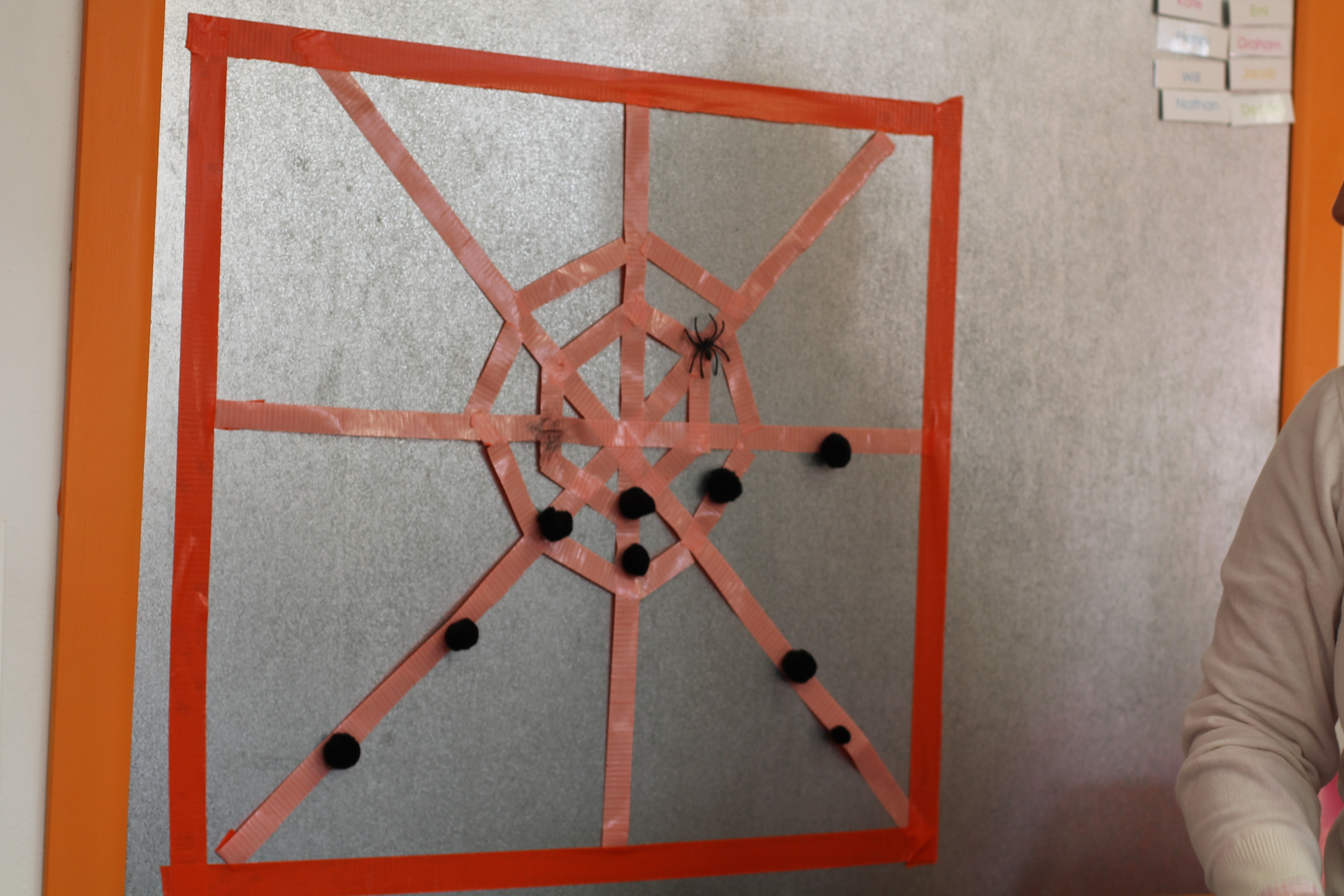 Today was all about spiders! Ms. Laurel brought in a daddy long leg spider for all the boys and girls to see during group time. Everyone was fascinated by the spider! We counted the spiders legs and talked about things that would be stuck on a spiders web. We read the story Spider on the floor by Bill Russell. Then the children had a chance to go up to the board and stick a “fly” on our spider web. It was very sticky!