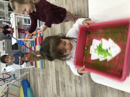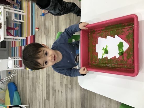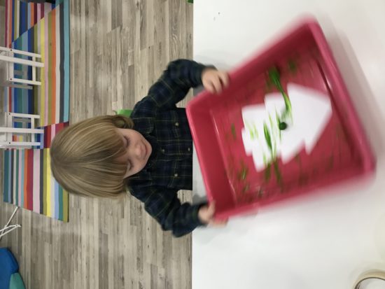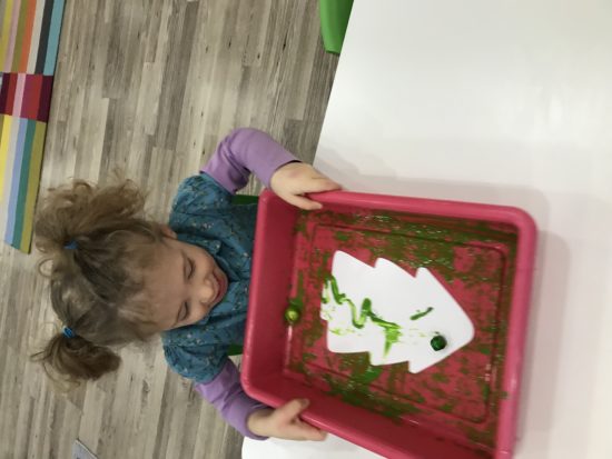 Using different tools to do art projects is something we love to do in our classroom! Our little learners got to jingle and shake a box to paint their Christmas tree our color of the month—green! We also sang “Jingle Bells” while we were shaking 🙂