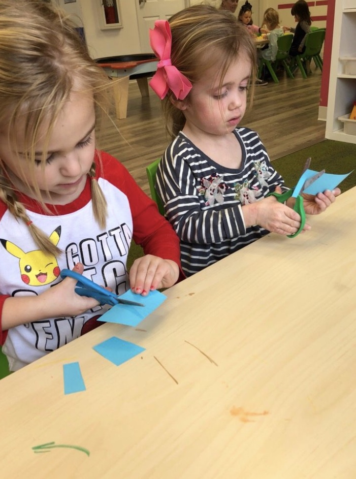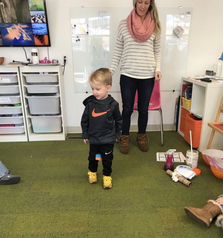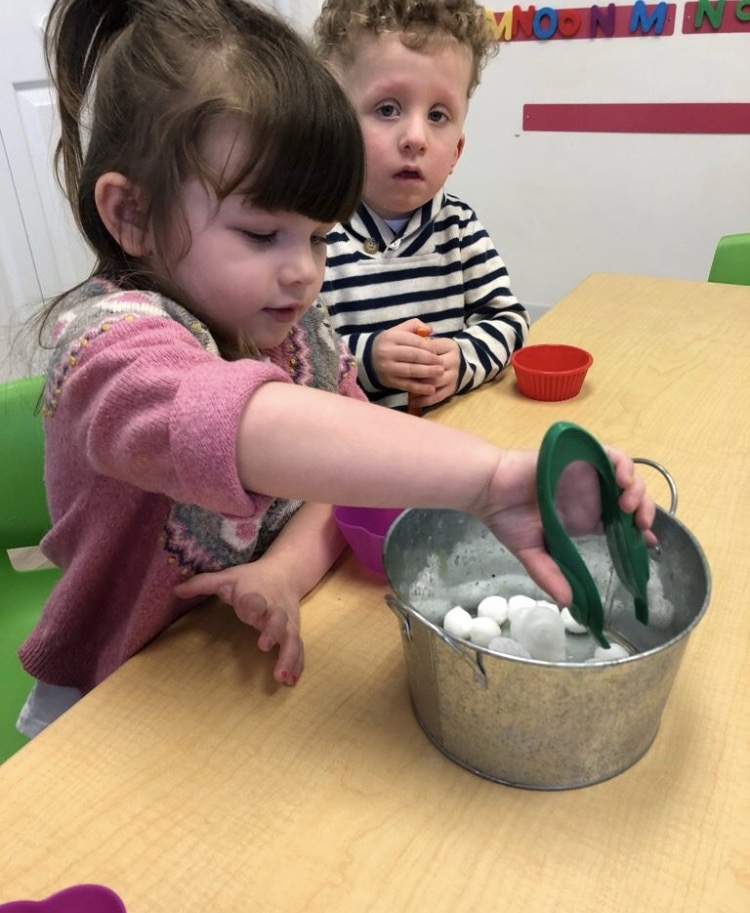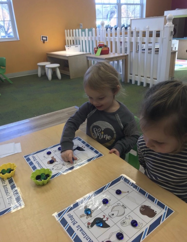 Our toddler classroom is filled with opportunities to explore, problem solve, create, and learn through play.  Our curriculum theme of the month is winter.  We have used this as a guide to introduce and practice new vocabulary, incorporate our focus of shape (rectangle) and color (white) of the month, practice fine and large motor skills, and build on natural curiosity through using our senses to learn and grow.