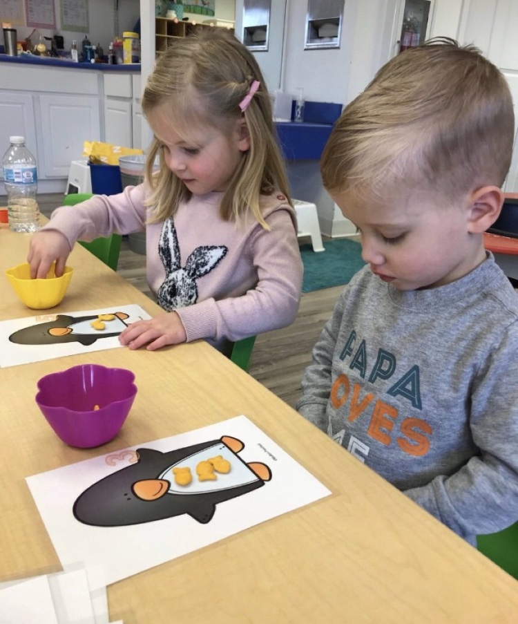 We focused in on the penguin for our science day! The kids learned that penguins have a layer of blubber to keep them warm. To help them understand this concept, we did an experiment to show the kids what blubber feels like for the penguins! We had two ice cold bowls of water. One bowl had a bag of coconut oil in it, to act as the blubber. They put one hand in each bowl and decided that the bowl with pretend blubber kept them warmer!