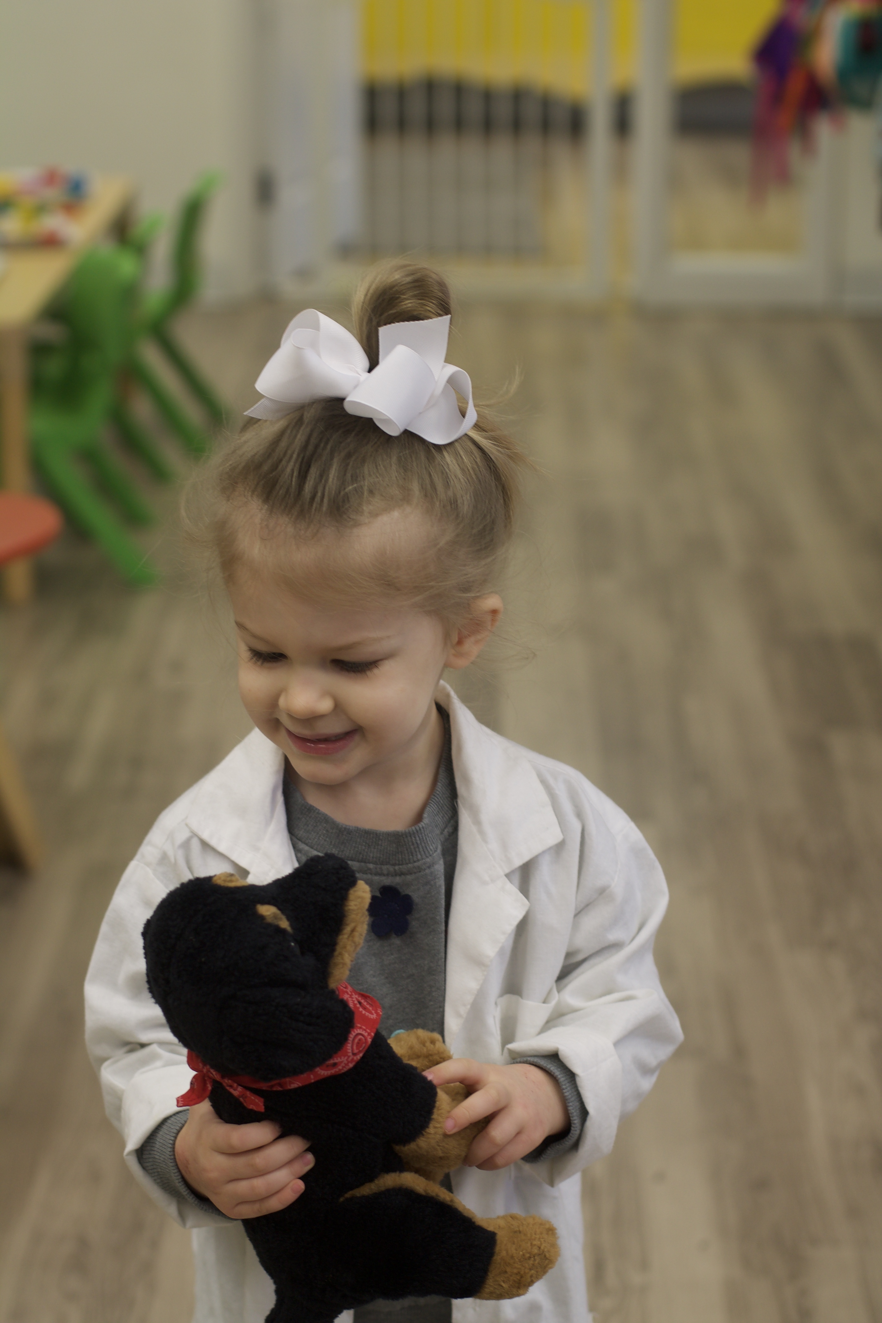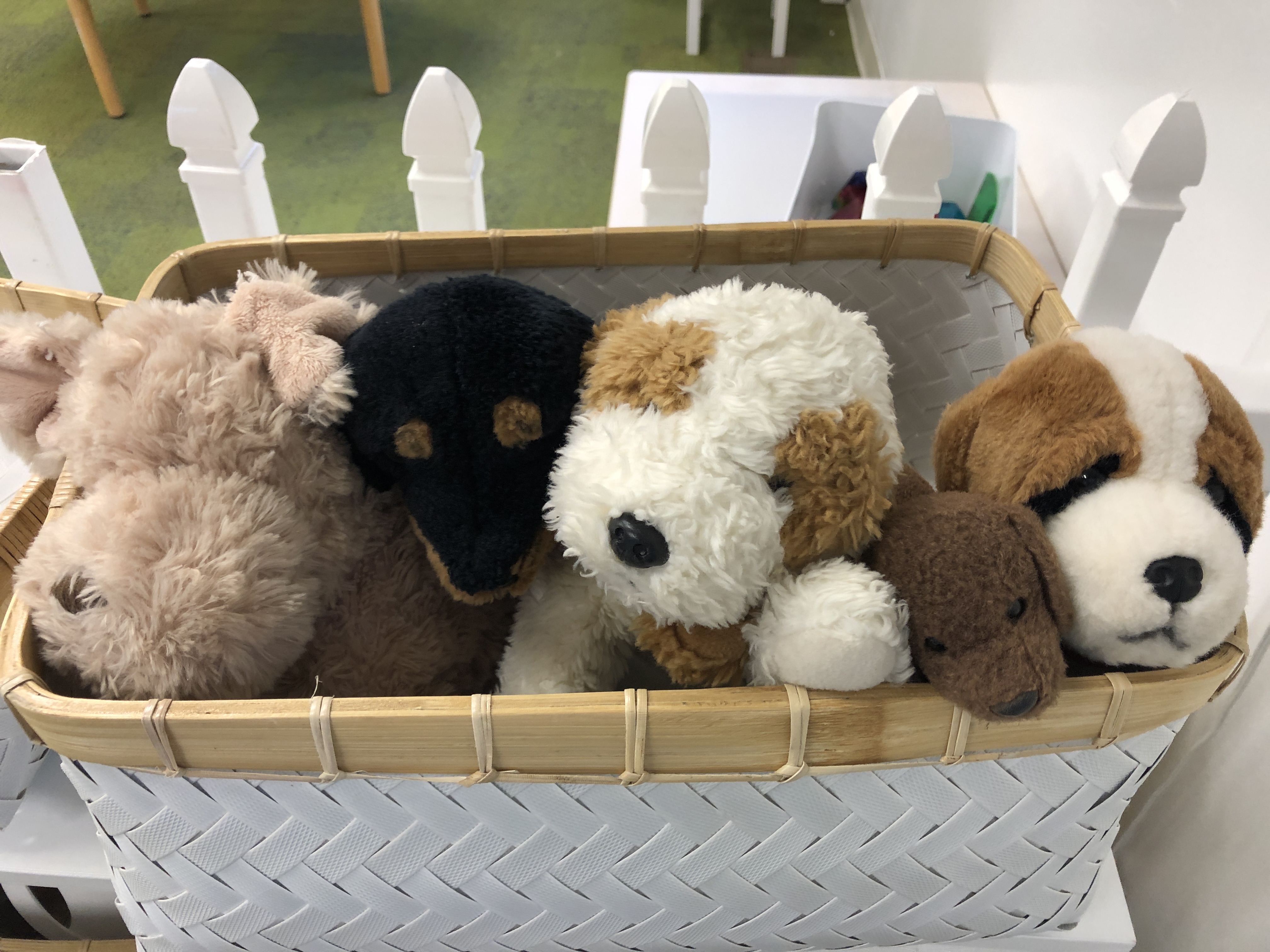 Our dramatic play center was converted into a veterinarian office.  The toddlers enjoy pretending to take care of the puppies.  They use new vocabulary, take turns, and get a little puppy snuggle.