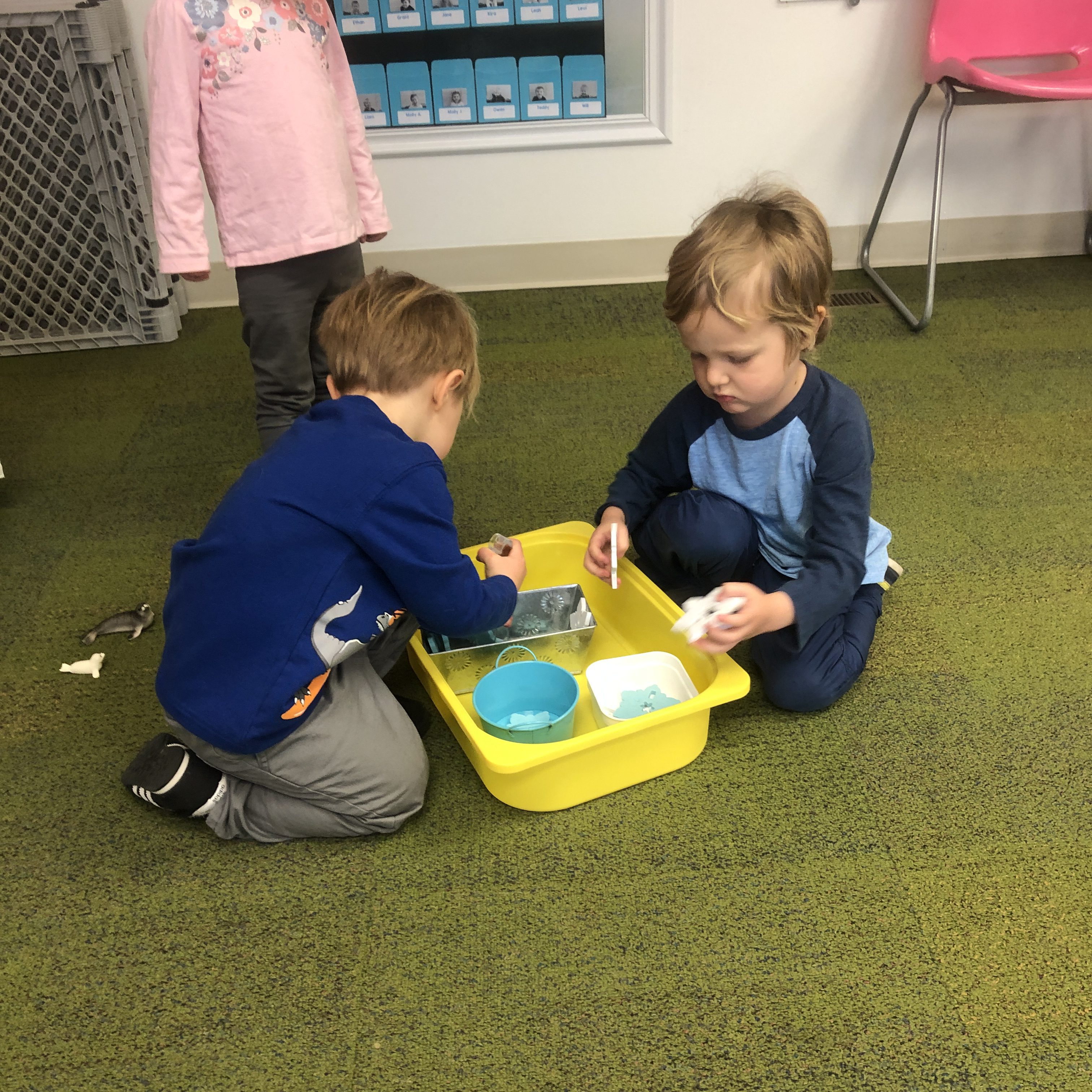 Free choice center opportunities provide toddlers with materials to explore and create igloos and “homes” for arctic animals.