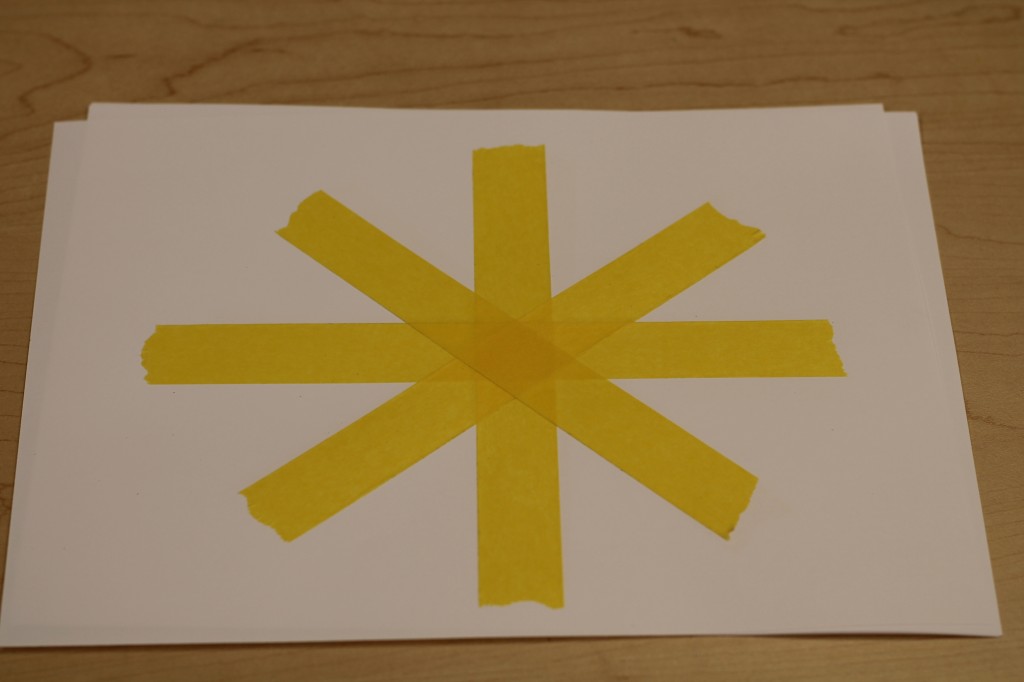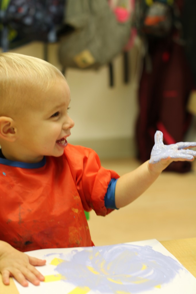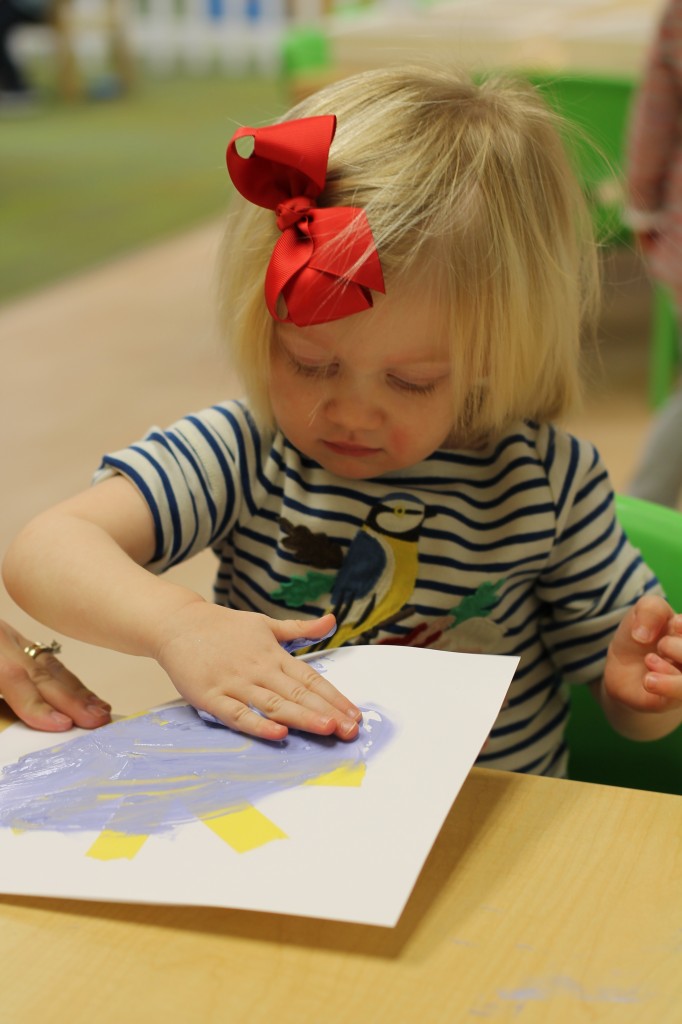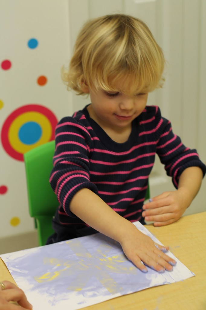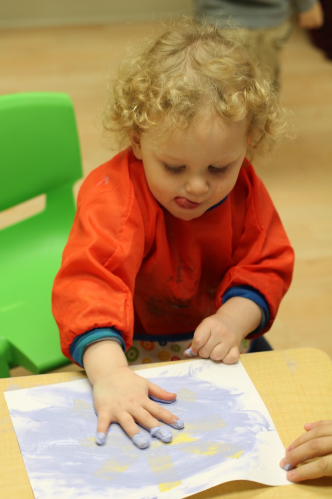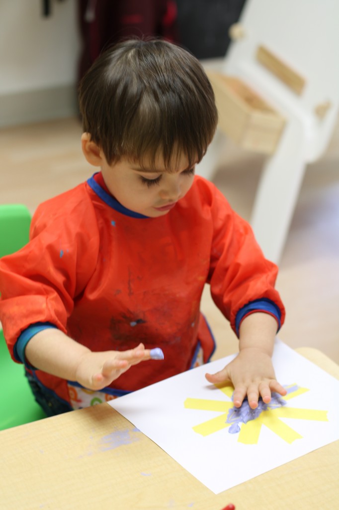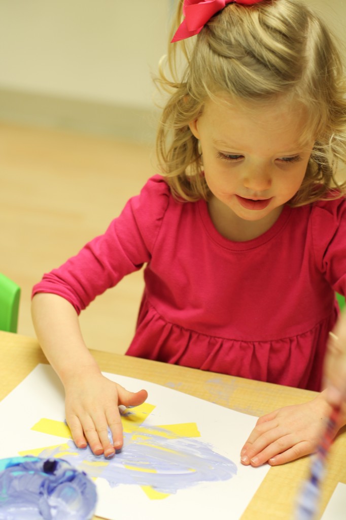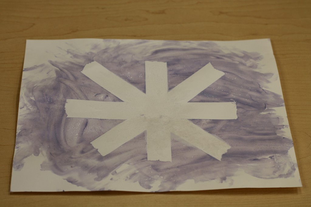 Ms. Diana put pieces of tape on the toddlers’ paper to look like a snowflake, and then the toddlers used their hands to paint over it. When the paint dried, Ms. Diana peeled the tape off to reveal a unique piece of resist art.