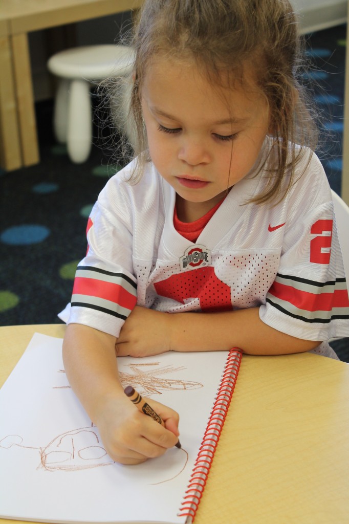 Children at the beginning stages often use “scribble writing” or random letters to represent words. As they progress, they will begin to use the letters that represent the sounds in the words that they are attempting to write (“btrfli” for butterfly). We make good use of the children’s growing phonics by helping them listen carefully to the words they wish to use. Our ultimate goal is for each child to learn to communicate on paper whether it is through words or illustrations.